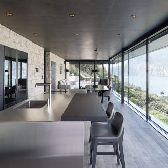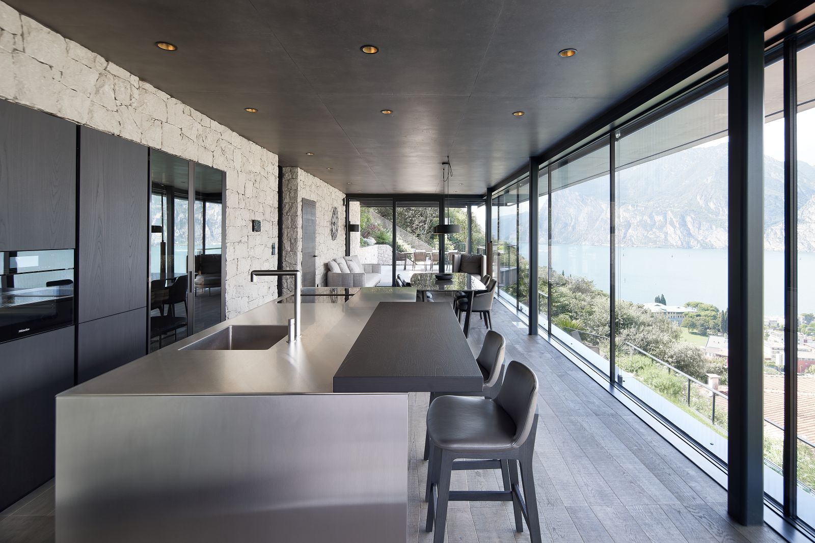 Il sito di costruzione si presentava come un ripido pendio calcareo, ma la sua esposizione a sud-ovest garantiva una vista aperta e spettacolare sul lago. Per superare la sfida topografica, Rubner Haus ha adottato una struttura a terrazze. L’architettura combina l’uso del legno, impiegato per la struttura portante e i rivestimenti interni, con materiali autoctoni, tra cui la pietra calcarea locale, il calcestruzzo a vista e ampie superfici vetrate. Il risultato è un organismo costruttivo che dialoga in sintonia con l’ambiente circostante.