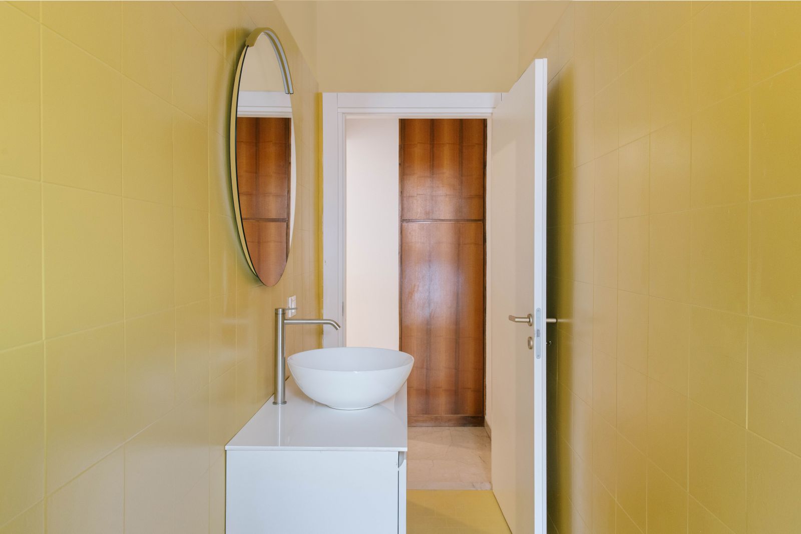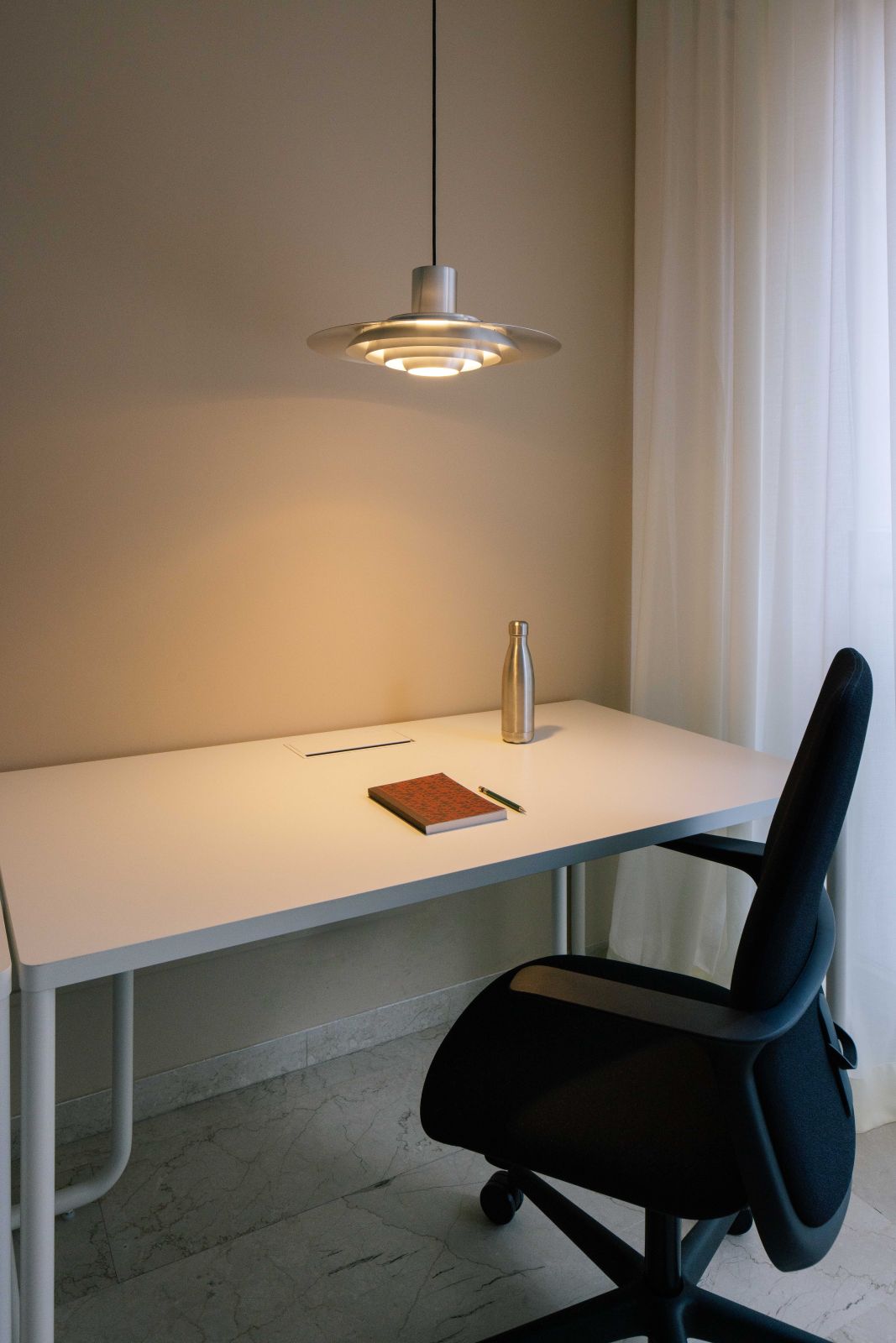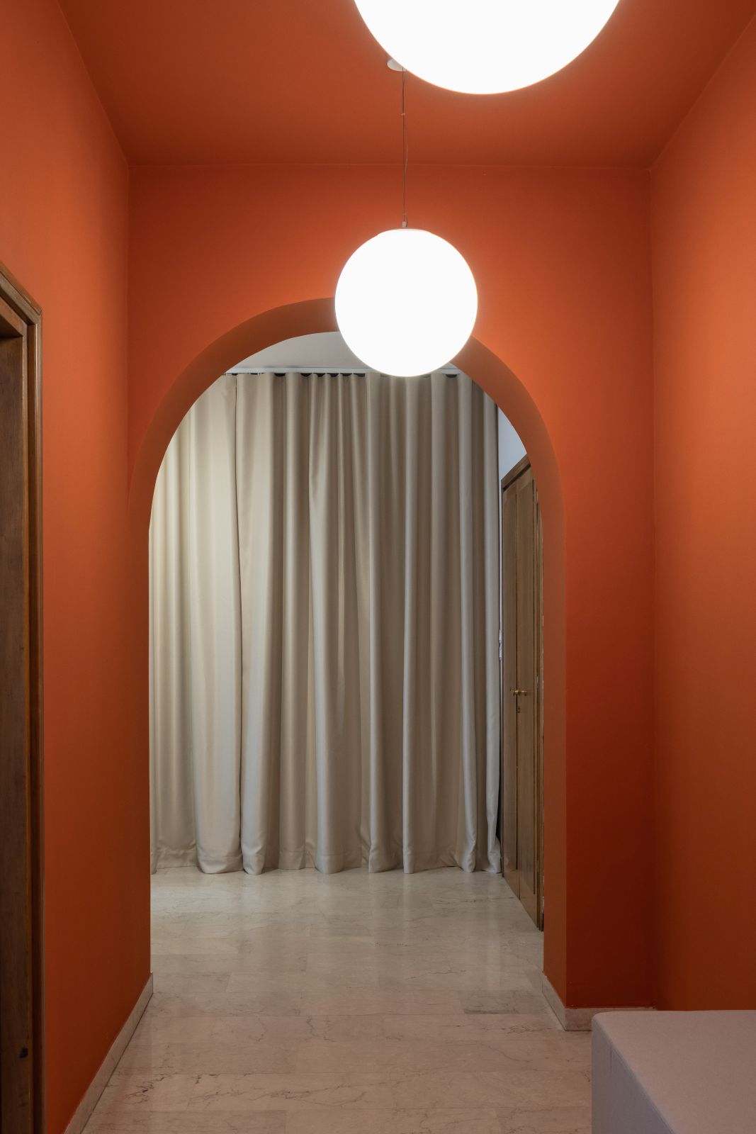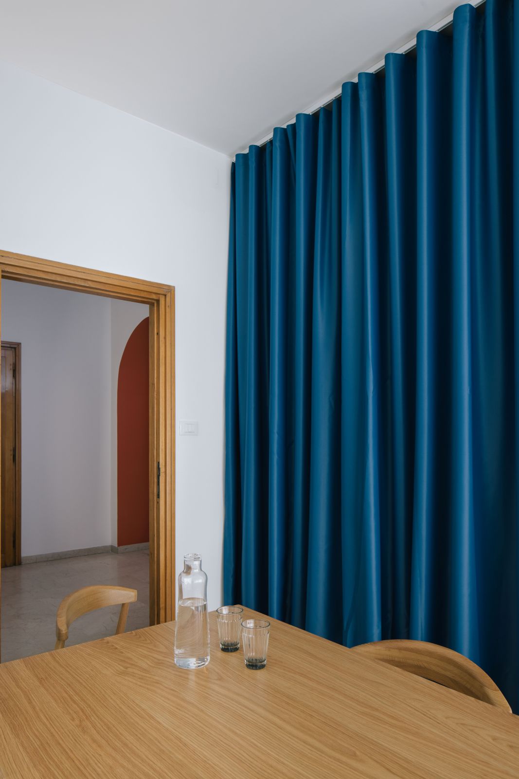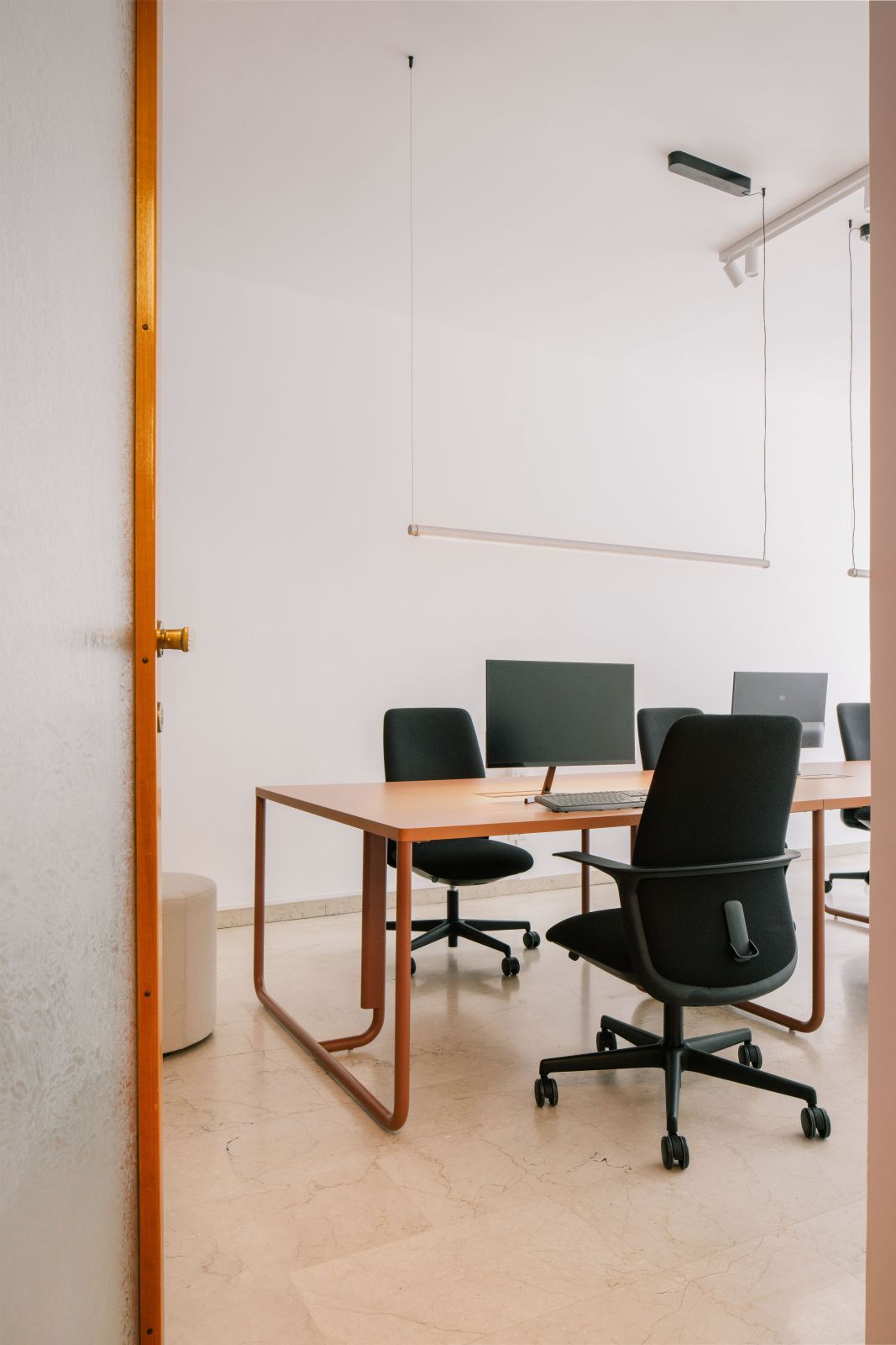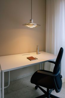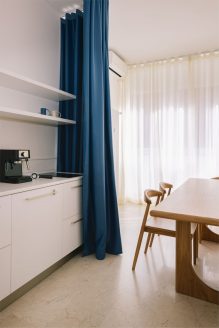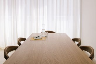 La distribuzione interna è stata pensata per incentivare il movimento e la connessione tra i colleghi: ne è un esempio il grande tavolo condiviso, vero e proprio fulcro operativo progettato per sostenere un approccio al lavoro di tipo collaborativo. Ogni dettaglio è stato curato per preservare la pulizia dello sguardo, come dimostra l’ingresso protetto da una tenda che funge da soglia soffice, o la mini cucina progettata per scomparire dietro un sipario quando non utilizzata, mantenendo intatto il rigore estetico dell’insieme.