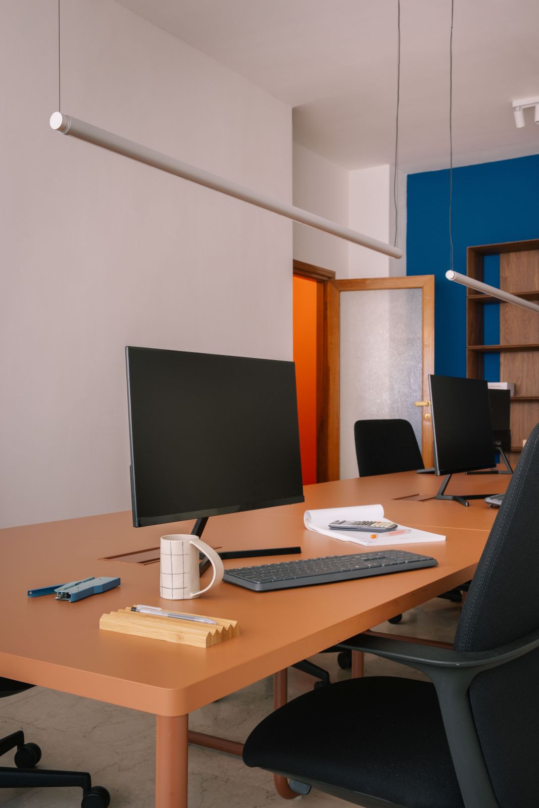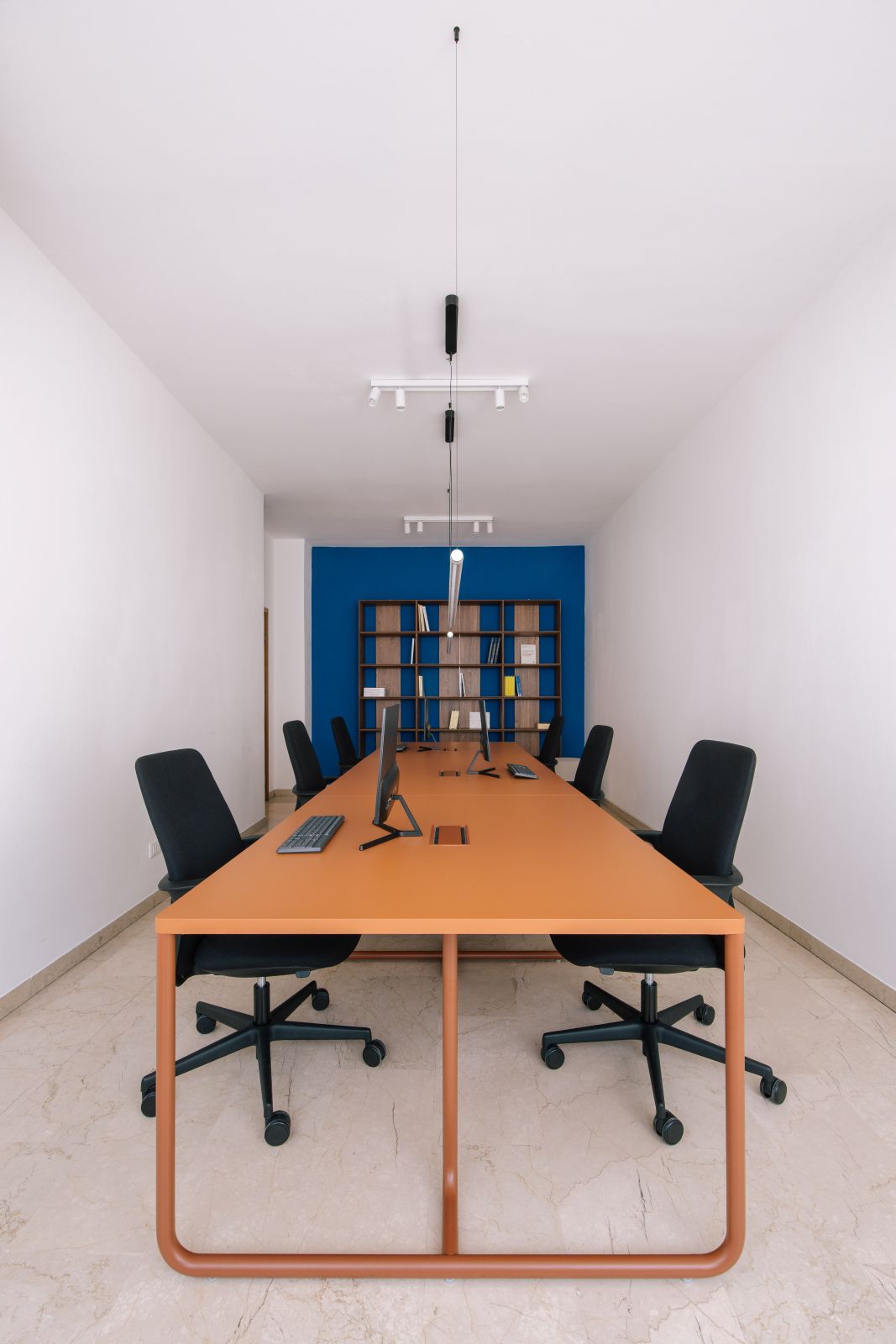 Un’attenzione particolare è stata riservata alla sala riunioni, dove il design si fa versatile per adattarsi alle diverse esigenze dello studio. In questo ambiente, il tavolo assume una funzione ambivalente: se da un lato è il luogo deputato al confronto professionale e formale, dall’altro si trasforma con naturalezza in uno spazio conviviale per le pause e i momenti più informali del team. Si tratta di un equilibrio misurato, volto a supportare la concentrazione senza rinunciare all’accoglienza, in una sintesi perfetta tra funzionalità e identità stilistica.