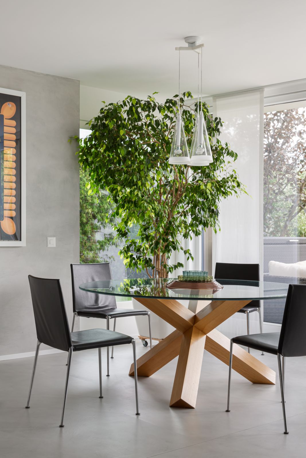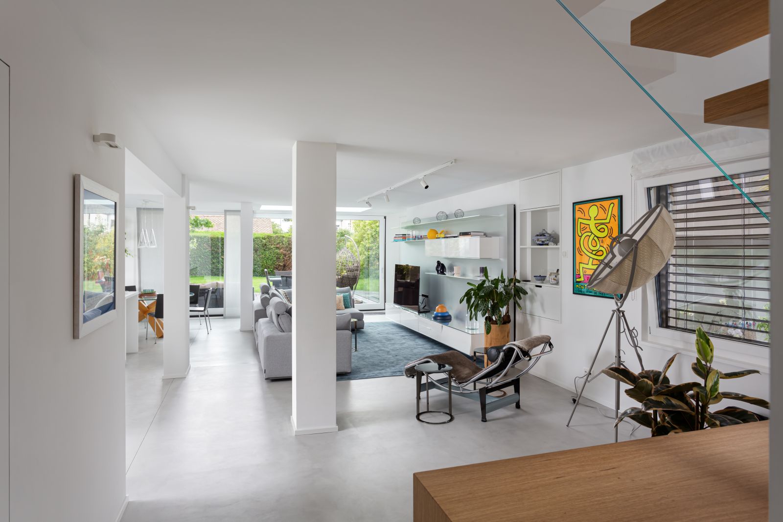 Il piano terra accoglie la zona giorno all’interno di una scatola in cemento che ospita un arioso open space, dove cucina a vista e living convivono armoniosamente. Una scelta progettuale di grande impatto è la completa “smaterializzazione” della parete affacciata sul giardino, sostituita da ampie vetrate scorrevoli: questa soluzione non solo garantisce una costante e profonda relazione visiva con l’esterno, ma amplifica anche la permeabilità spaziale, invitando la natura a far parte dell’esperienza abitativa.