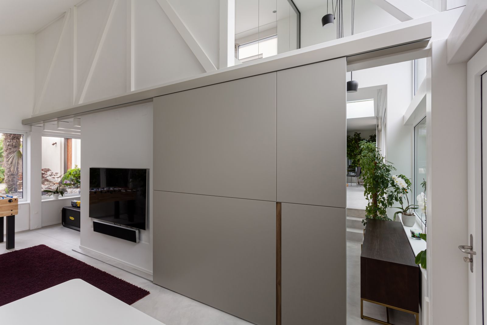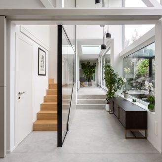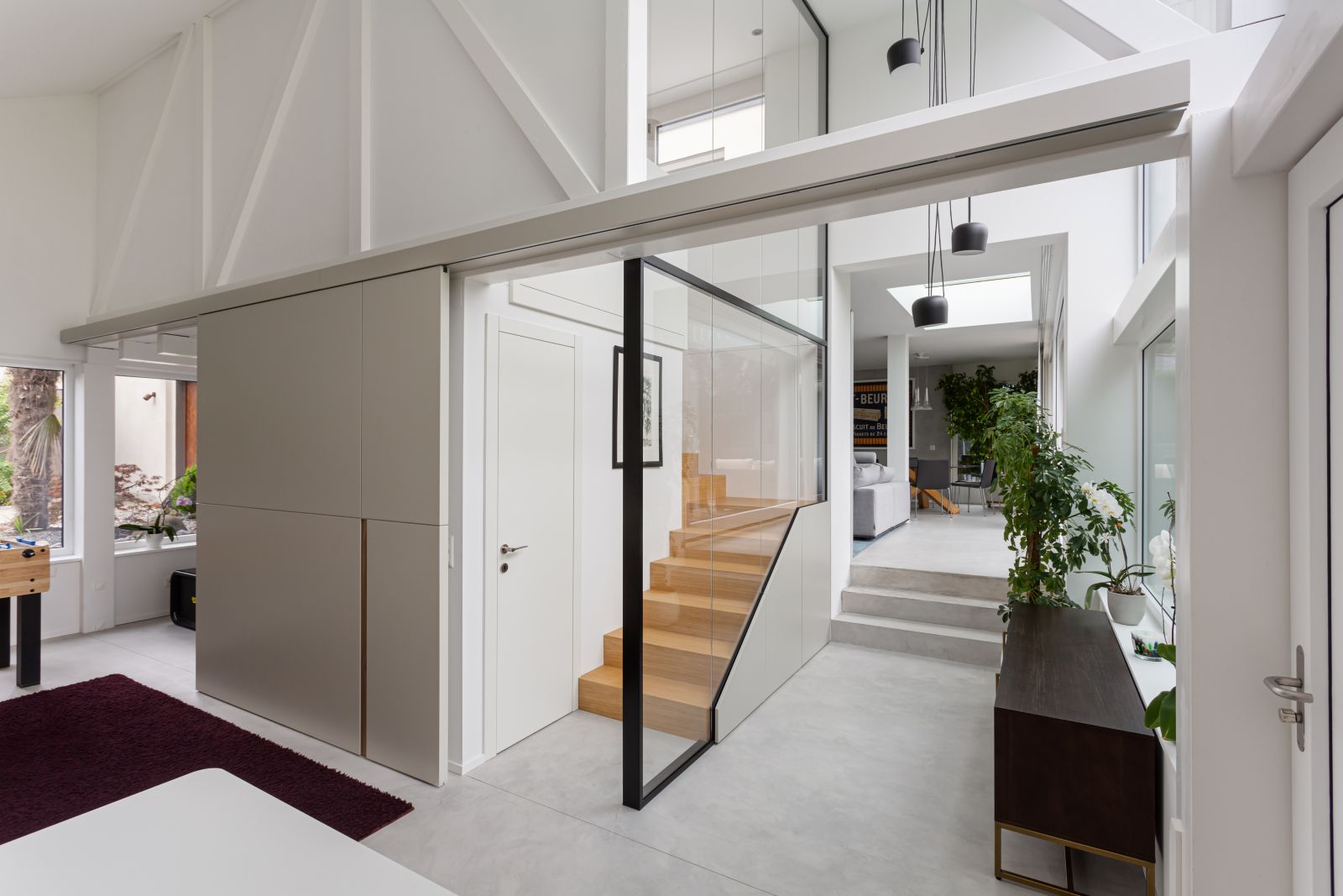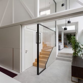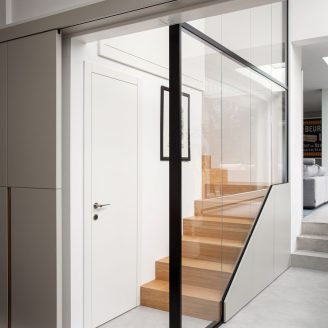Sempre al piano terra, un secondo volume, autonomo e distintivo, è dedicato all’atelier. Realizzato in vetro e legno, questo organismo architettonico si presenta indipendente sia a livello linguistico che funzionale. Il suo tetto a due falde nasconde un soppalco che ospita una piccola camera per gli ospiti e uno studio, aggiungendo versatilità allo spazio. La scala in legno con parapetti vetrati, che conduce al soppalco, è stata ingegnosamente progettata per poter essere schermata da una parete scorrevole custom made che, una volta chiusa, segna anche il confine con la zona living, offrendo privacy e flessibilità.
