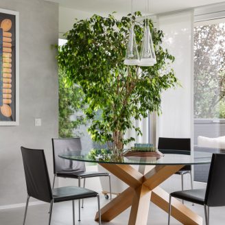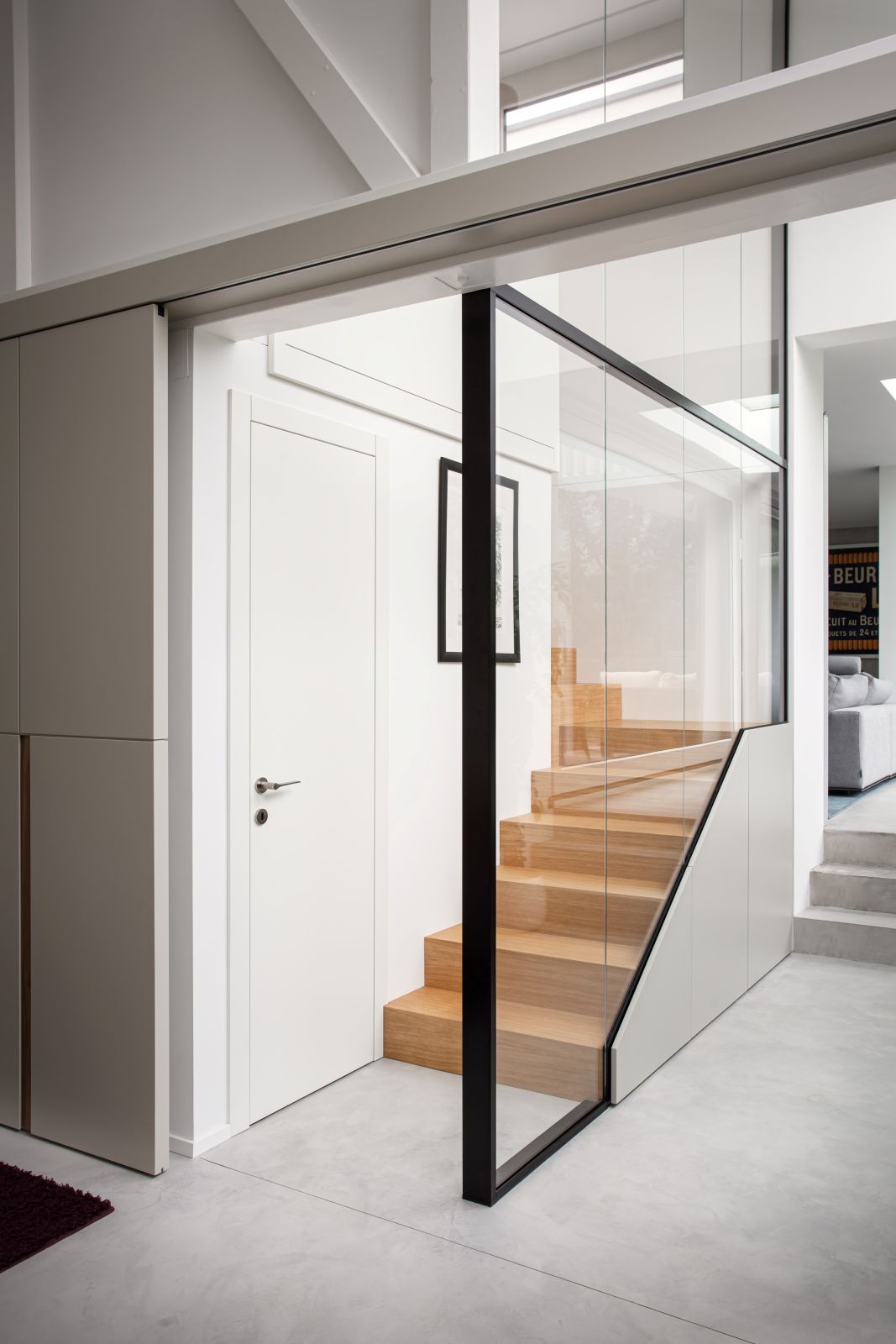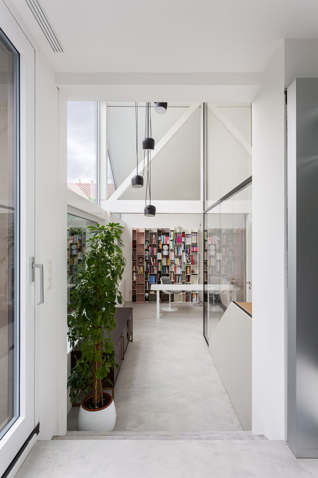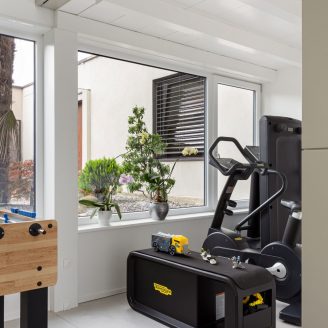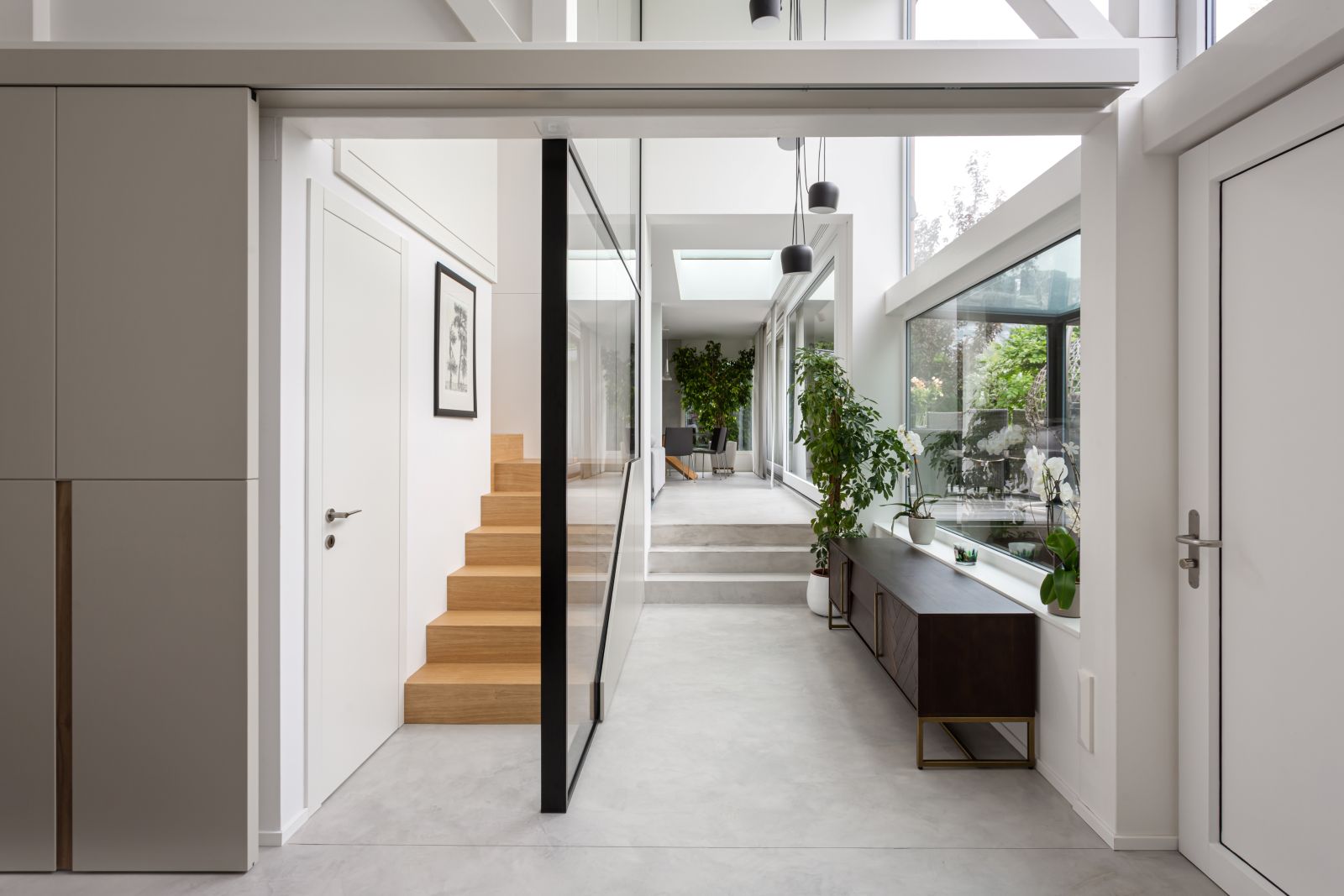 Sempre al piano terra, un secondo volume, autonomo e distintivo, è dedicato all’atelier. Realizzato in vetro e legno, questo organismo architettonico si presenta indipendente sia a livello linguistico che funzionale. Il suo tetto a due falde nasconde un soppalco che ospita una piccola camera per gli ospiti e uno studio, aggiungendo versatilità allo spazio. La scala in legno con parapetti vetrati, che conduce al soppalco, è stata ingegnosamente progettata per poter essere schermata da una parete scorrevole custom made che, una volta chiusa, segna anche il confine con la zona living, offrendo privacy e flessibilità.