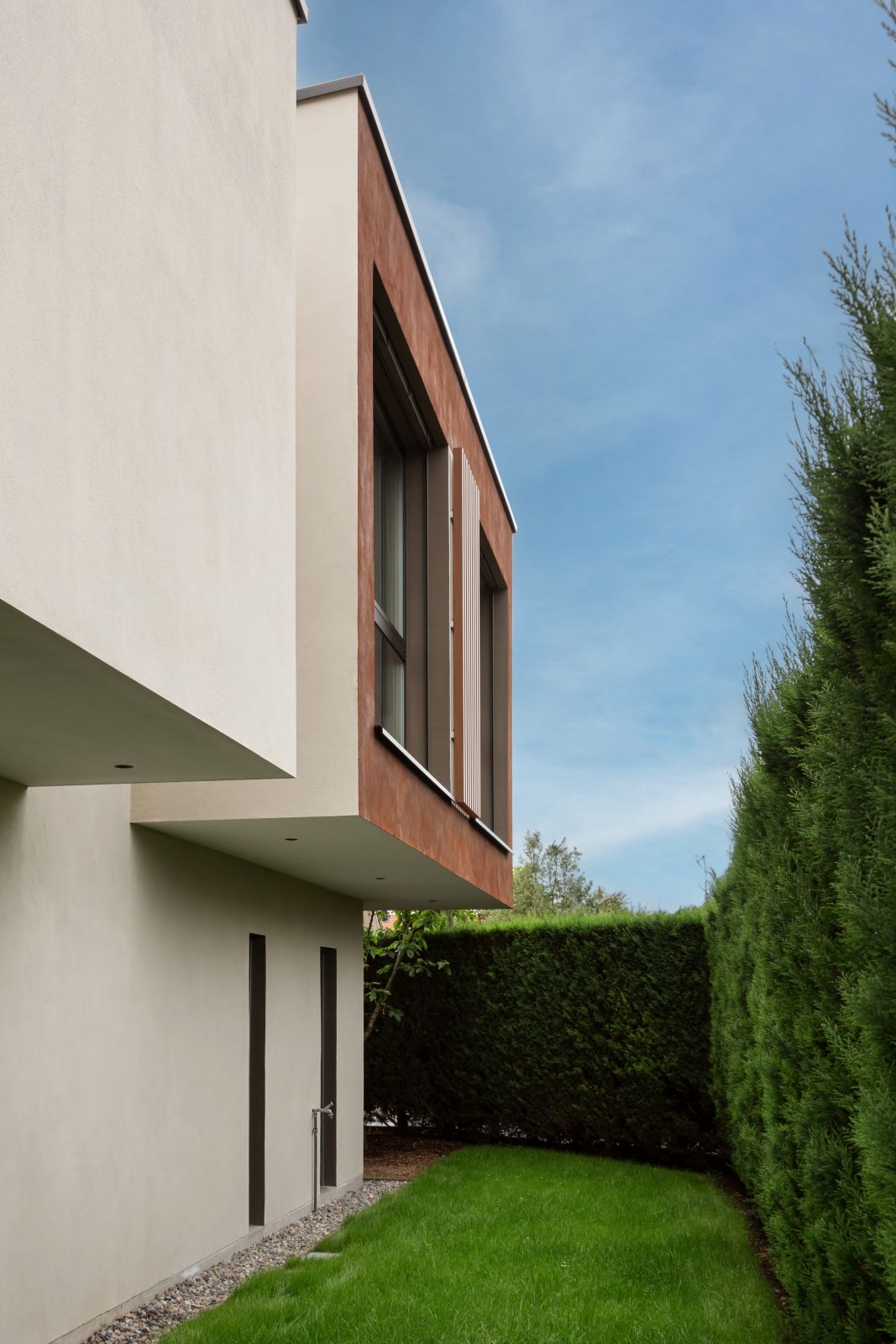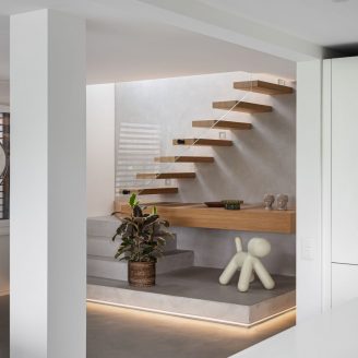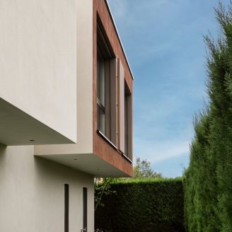 L’architettura dell’edificio si articola infatti in una serie di volumi indipendenti e funzionali, organizzati secondo il principio delle “scatole interconnesse”. Questa logica progettuale attribuisce a ogni volume una specifica funzione primaria, in un bilanciamento magistrale tra rigore concettuale, essenzialità espressiva e un comfort abitativo percepibile in ogni dettaglio. Gli spazi interni ed esterni sono connotati da rivestimenti continui che ne enfatizzano lo stile razionale.