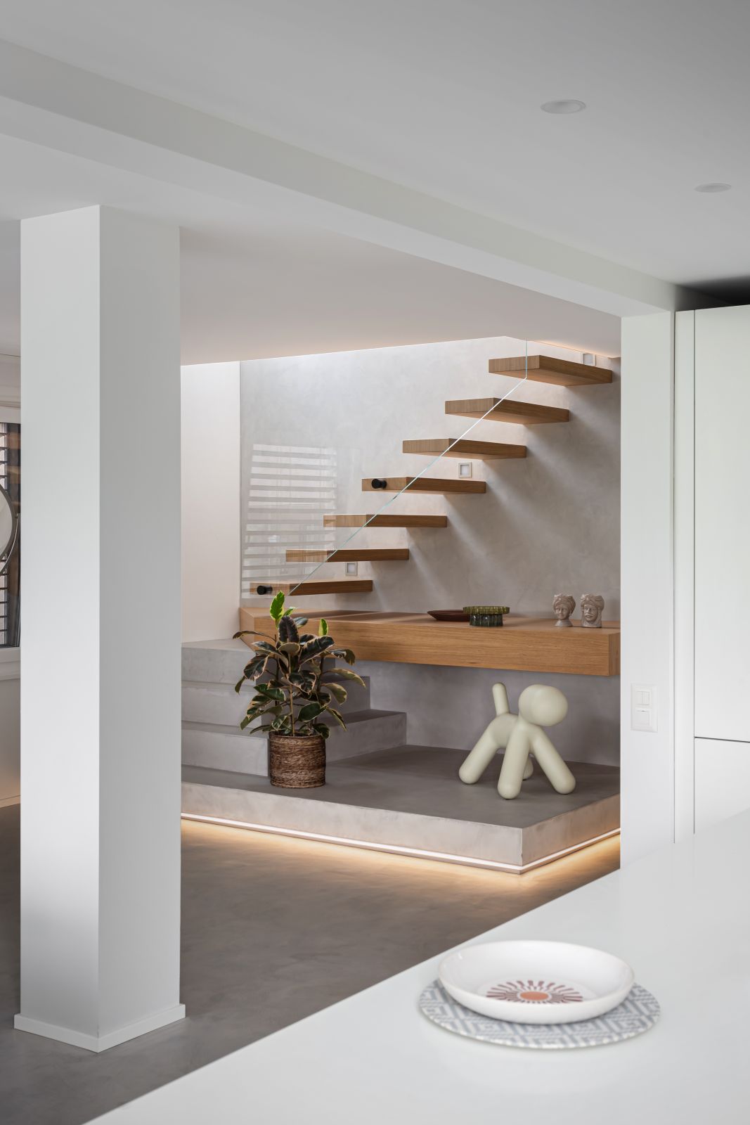 Ma il vero fil rouge materico che attraversa l’intera abitazione è il cemento. Questo materiale non è limitato all’involucro architettonico, ma si estende alle superfici interne, connotando la pavimentazione, la parete della cucina, i gradini iniziali della scala verso la zona notte e il setto laterale della scala stessa.