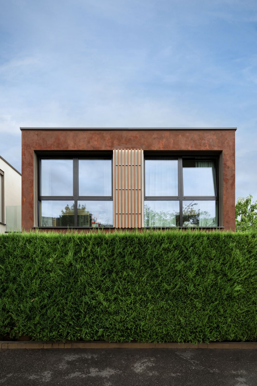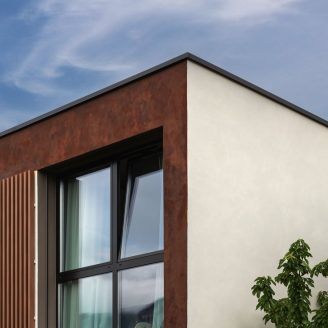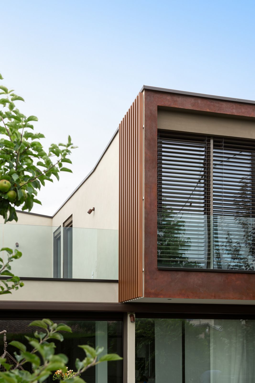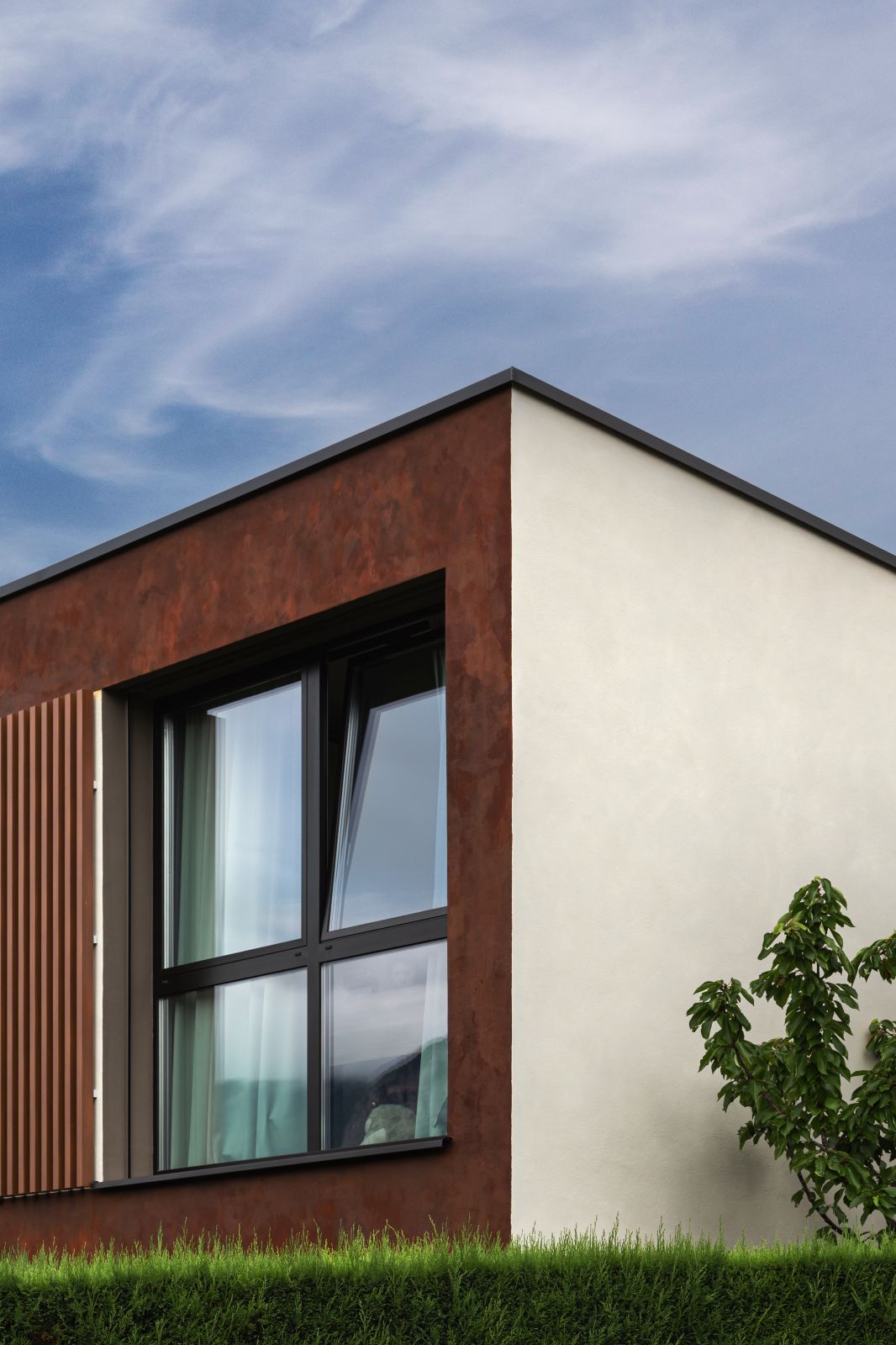Sul fronte esterno, il volume aggettante che sormonta la zona giorno, protendendosi verso il giardino, è stato valorizzato con Oxydecor Rust di Isoplam. Questo rivestimento cementizio riproduce fedelmente l’effetto materico dell’acciaio corten, noto per la sua resistenza, impermeabilità e forte aderenza. Grazie alla sua formulazione esclusiva, ricrea l’effetto ruggine anche su materiali che non subiscono il processo di ossidazione. Le tipiche tonalità ruggine bruno-rossastre dialogano qui armoniosamente con la vegetazione del giardino e il legno invecchiato del dehors. Il risultato è un involucro vibrante e multisensoriale che sigilla un profondo rapporto tra architettura e natura, celebrando l’armonia cromatica e materica.