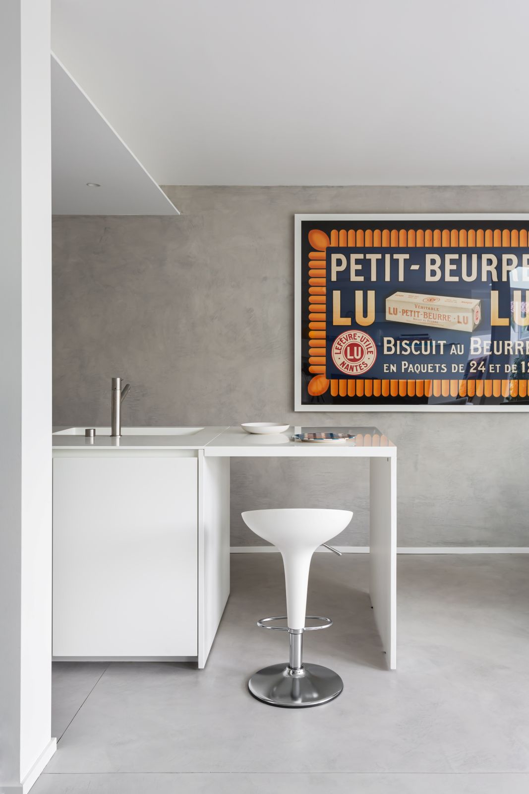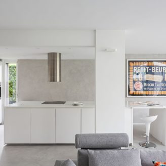 Per queste superfici interne, sia orizzontali che verticali, è stato impiegato il Microverlay di Isoplam, un rivestimento continuo a base cementizia. Con soli 3 mm di spessore, preserva la robustezza del calcestruzzo tradizionale, offrendo al contempo un’incredibile cura del dettaglio e un alto valore estetico. L’effetto visivo vellutato e la tonalità neutra amplificano la percezione dello spazio e garantiscono una continuità armoniosa tra gli ambienti, in perfetta sintonia con il lessico modernista e l’impronta essenziale dell’interior design.
