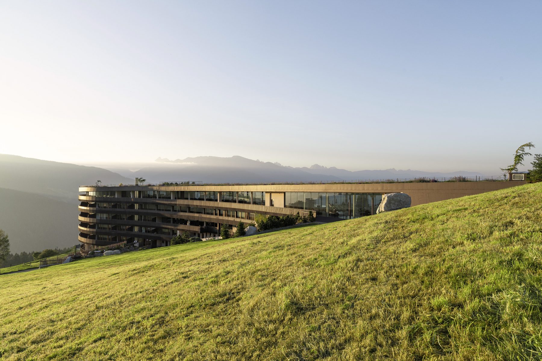 “Mi sono divertito a creare questa forma originale e armoniosa, traendo ispirazione dal paesaggio altoatesino con le sue montagne, i ghiacciai, le slavine” ha commenta l’architetto Ralf Dejaco. “Una forma che, oltre a essere piacevole alla vista e a integrarsi con il paesaggio circostante, è anche funzionale perché garantisce un’ottima esposizione solare alle 70 ampie camere familiari, che con questa soluzione hanno tutte un balcone esterno e una vista panoramica sulla Valle Isarco, il Sass de Putia e la Val Pusteria“.