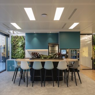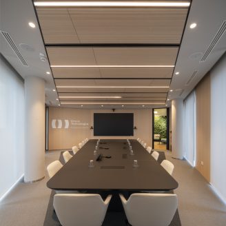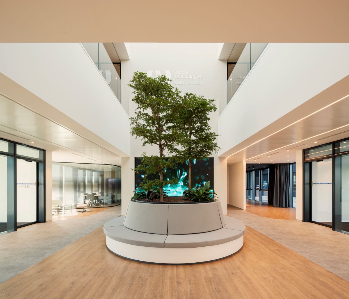 La distribuzione funzionale interna, frutto di un’accurata workplace analysis condotta da DEGW, ha permesso di aggiungere oltre 3.000 mq di superficie utile per supportare le nuove esigenze operative. Il piano terra del volume originario ospita ora funzioni collettive come la reception, un’area experience per i clienti, un auditorium riconfigurabile, spazi di coworking e il ristorante aziendale. Al livello superiore, il nuovo volume accoglie le postazioni di lavoro distribuite tra uffici chiusi, open space, sale riunioni, formali e informali, break area, uffici in sharing, una board room e l’ufficio dell’Amministratore Delegato. Il cuore sociale dell’edificio è rappresentato da un’agorà a gradoni concentrici, una cerniera circolare che favorisce l’incontro tra le persone in uno spazio a doppia altezza luminoso e arioso.