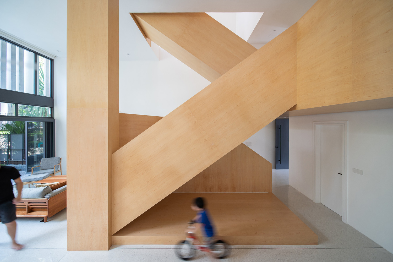 Gli elementi architettonici originali della casa sono stati resi omogenei attraverso l’uso di pannelli di legno che collegano la scala, centrale nell’economia della struttura, al piano soppalcato: qui si sviluppa un percorso spaziale punteggiato da mensole, finestre e contenitori, che culmina con un’area studio/lounge quasi “sospesa” tra le cime degli alberi del giardino.
