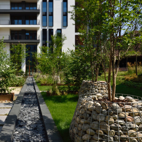 Segni di questa natura sono il grande giardino interno (oltre 1000 mq) il ridisegno della piazza esterna e di tutta Via Rosales, che ricuce il rapporto tra facciate ed esterni dando continuità al verde tra spazio pubblico e privato; l’edificio, preesistente, è stato del resto completamente ristrutturato dallo studio Asti Architetti in un’operazione di grande valore nel riqualificare l’intero isolato.