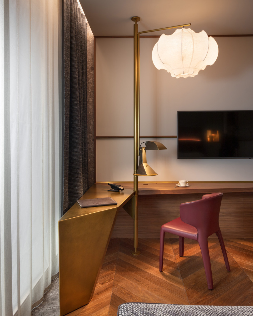 Al centro del progetto, che offre 173 camere distribuite su 12 piani ai quali si aggiungono il rooftop di 530 metri quadri al 13esimo piano e 4 Penthouse Suite, ci sono Milano e il concetto di milanesità: l’interior reinterpreta in chiave contemporanea la tradizione del design “alla milanese”, citando l’elegante modernità dei Maestri meneghini del dopoguerra, presenti in numerosi dettagli materici come l’impiego dei marmi policromi e la citazione del ceppo lombardo.