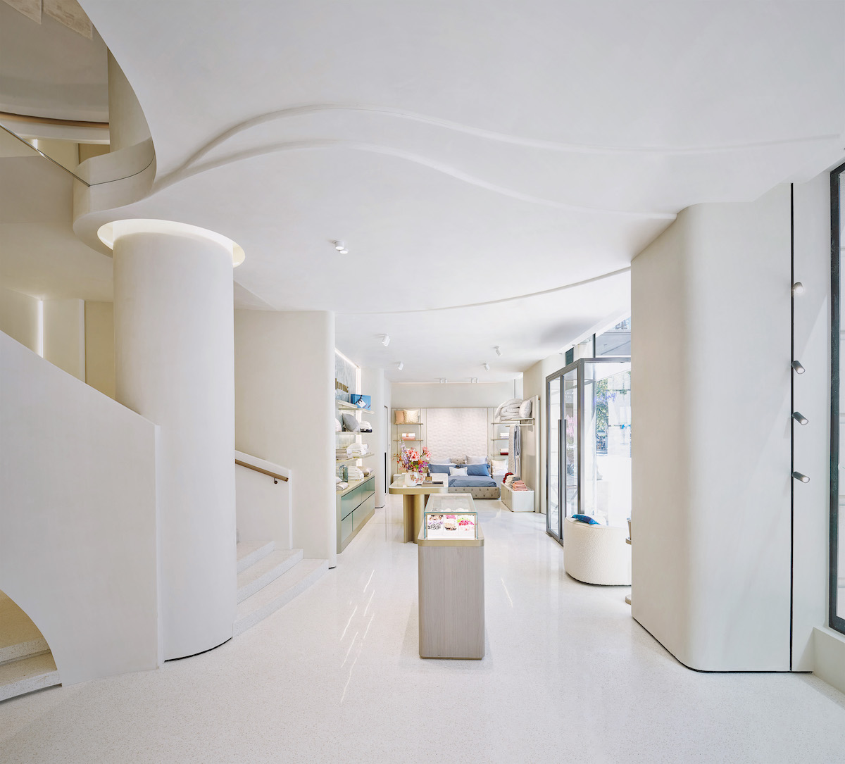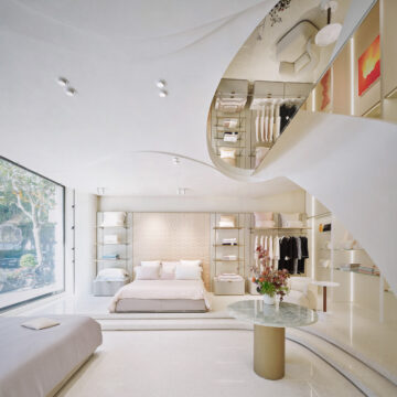 Anche gli arredi sono tutti stati pensati e scelti per ottenere dei movimenti fluidi dando la sensazione di un abbraccio morbido e soffice proprio come quello che sanno donare i capi in vendita nello showroom. Tra l’arredo spiccano: il divano imbottito Julep, dalla forma ricurva in stile anni ’50, del designer svedese Jonas Wagell per Tacchini; le sedute dalla silhouette ondulata Etcetera, scelte nella cromia sand beige; la poltroncina Getlucky, disegnata da Patricia Urquiola per Moroso e la seduta Ico, firmata da Ora Ito per Cassina.