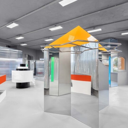 Sui tre piani che compongono lo spazio, grandi blocchi espositivi, ognuno unico nella sua forma e dimensione, sono stati realizzati con una tavolozza di uno o due colori: all’interno dello scenario grigio, infatti, la loro forma e la loro vibrante presenza galleggiano come le boe in mare nell’ampia baia di Porto Cervo; inoltre, le superfici espositive della collezione iconica di MODES sono realizzate su misura e trattate con varie finiture metalliche, galvanizzato, anodizzato, spazzolato o lucidato per una presenza neutra e poco invasiva.