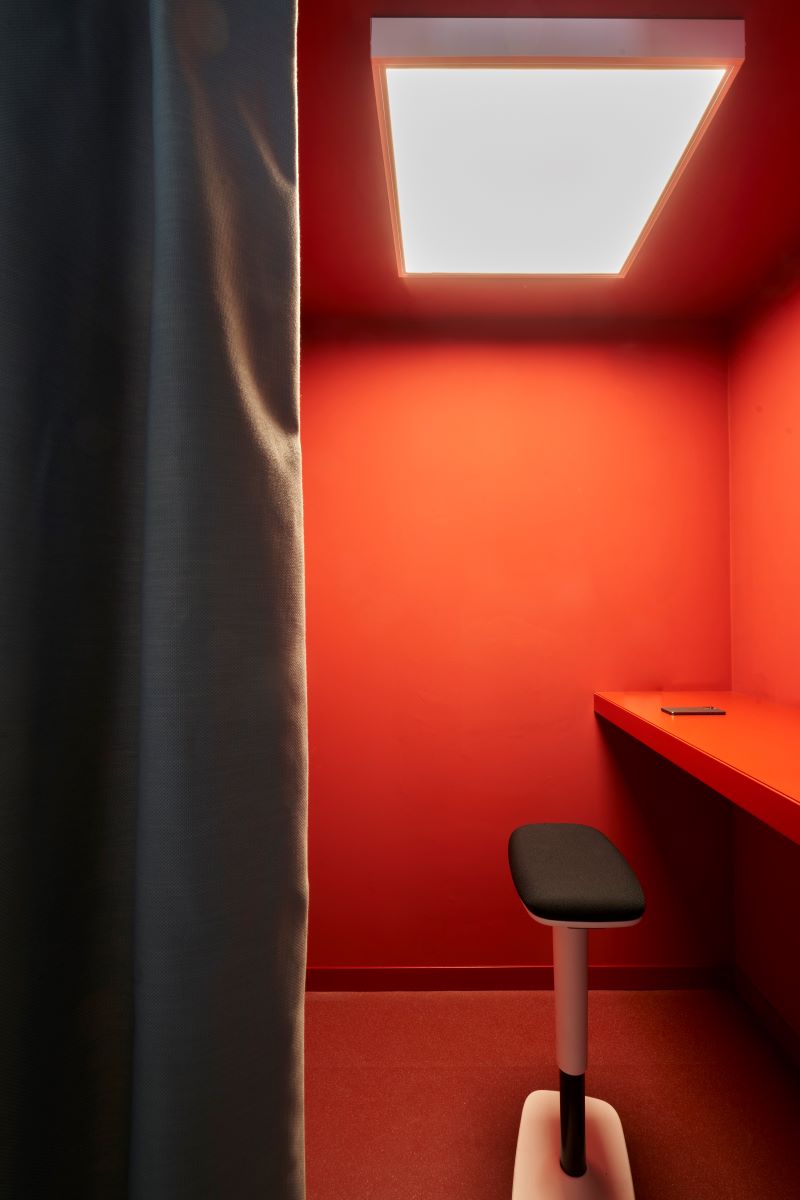 L’open space è divisibile tramite una tenda acustica in due zone: un’area organizzata con una serie di isole operative a quattro postazioni, e un’area flessibile, caratterizzata da postazioni modulari componibili in diverse configurazioni a seconda dell’attività svolta (corsi di aggiornamento, riunioni, comunicazioni dell’azienda al personale). A collegare visivamente l’open space con la sala riunioni ci pensano vetrate trasparenti con sottili profili rossi e un’ampia porta scorrevole a due ante.