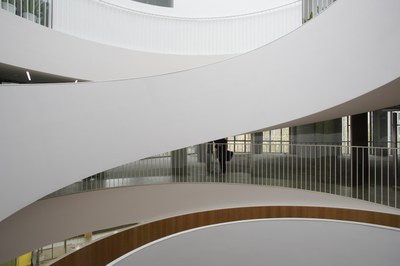 Analogamente, gli interni vengono trattati alla stregua di un vero e proprio “paesaggio” attraverso l’introduzione di elementi come la vegetazione, la luce solare, i materiali sostenibili, mentre il nucleo dell’edificio si articola attorno a una scenografica scala a elica, avviluppata attorno a un vuoto centrale di cinque metri di diametro, che cita la celebre spirale del Guggenheim di New York.