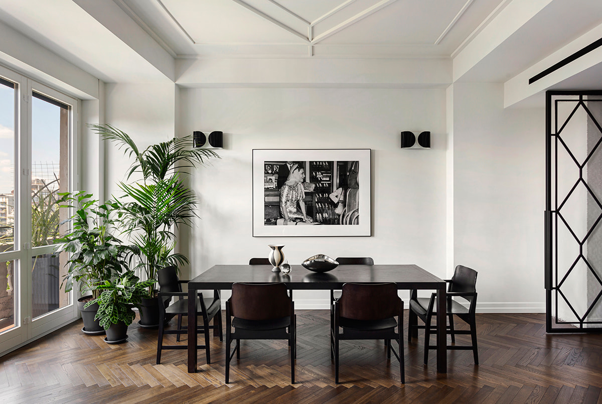 A Milano lo studio Nomade Architettura ha completato Casa EF, caratterizzata da uno stile classico rivisitato in chiave moderna, grazie anche alla reinterpretazione di elementi come le cornici a soffitto e il parquet a spina.