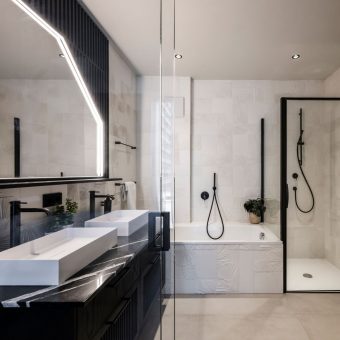 Le superfici sono a contrasto: la quarzite nera “Noirblanc” di Antolini è stata impiegata per il piano della cucina, del mobile bar e per il coffee table, mentre per il tavolo da pranzo i progettisti hanno scelto la quarzite bianca “Montblanc” di Favorita. Il bianco torna anche nelle superfici dei bagni, dove le piastrelle della collezione Flora di Bottega Nove riprendono come in una macrofotografia grandi foglie di palma polinesiana.