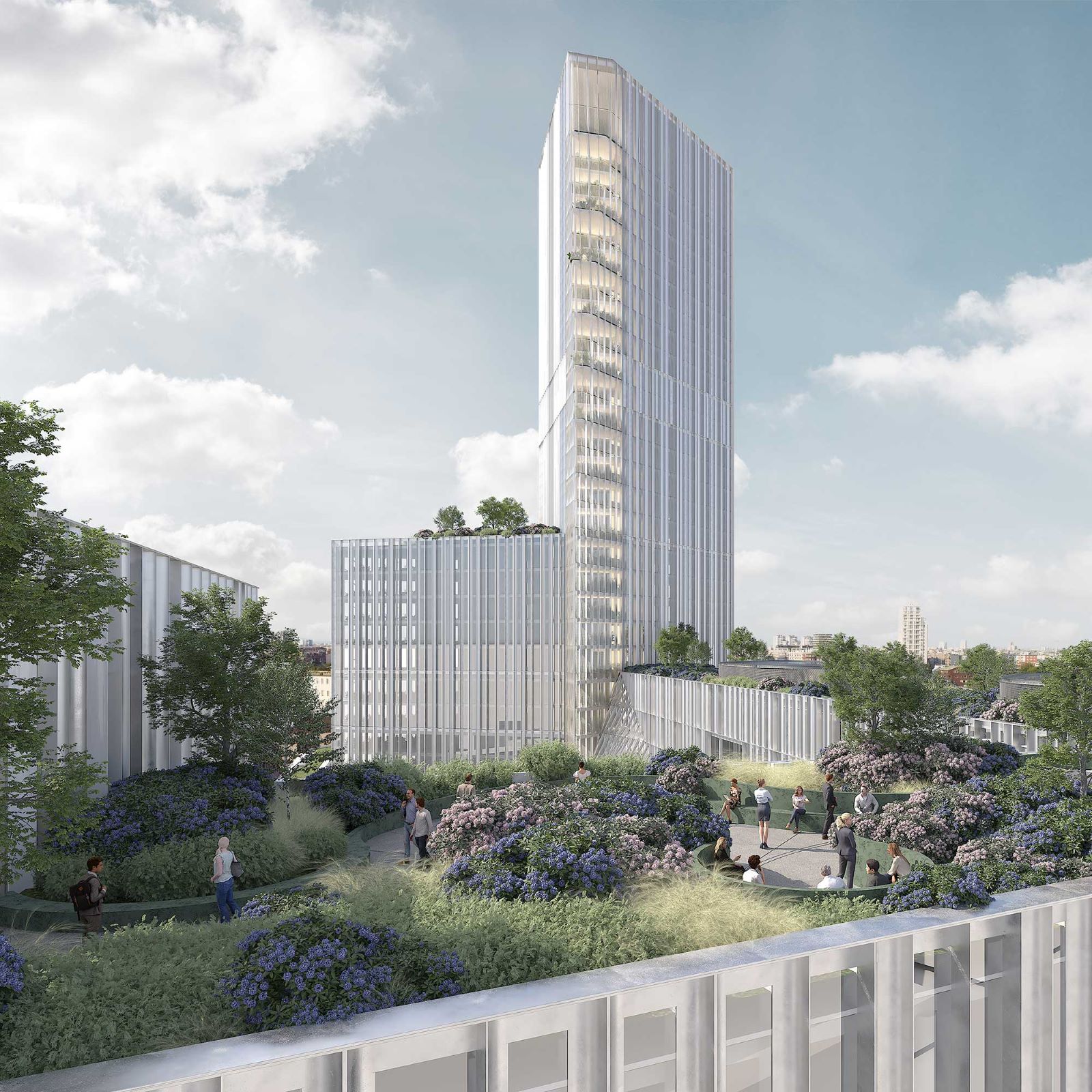 Il complesso architettonico nasce da una dimensione urbana orizzontale e culmina con una torre di 26 piani verso via Rosellini. La verticalità è enfatizzata da una spina dorsale costituita da terrazze verdi a doppia e tripla altezza, riconoscibile dall’esterno grazie a specchiature modulari di vetro fotovoltaico, che si sfoga in un grande tetto giardino pensile sulla copertura del corpo basso.