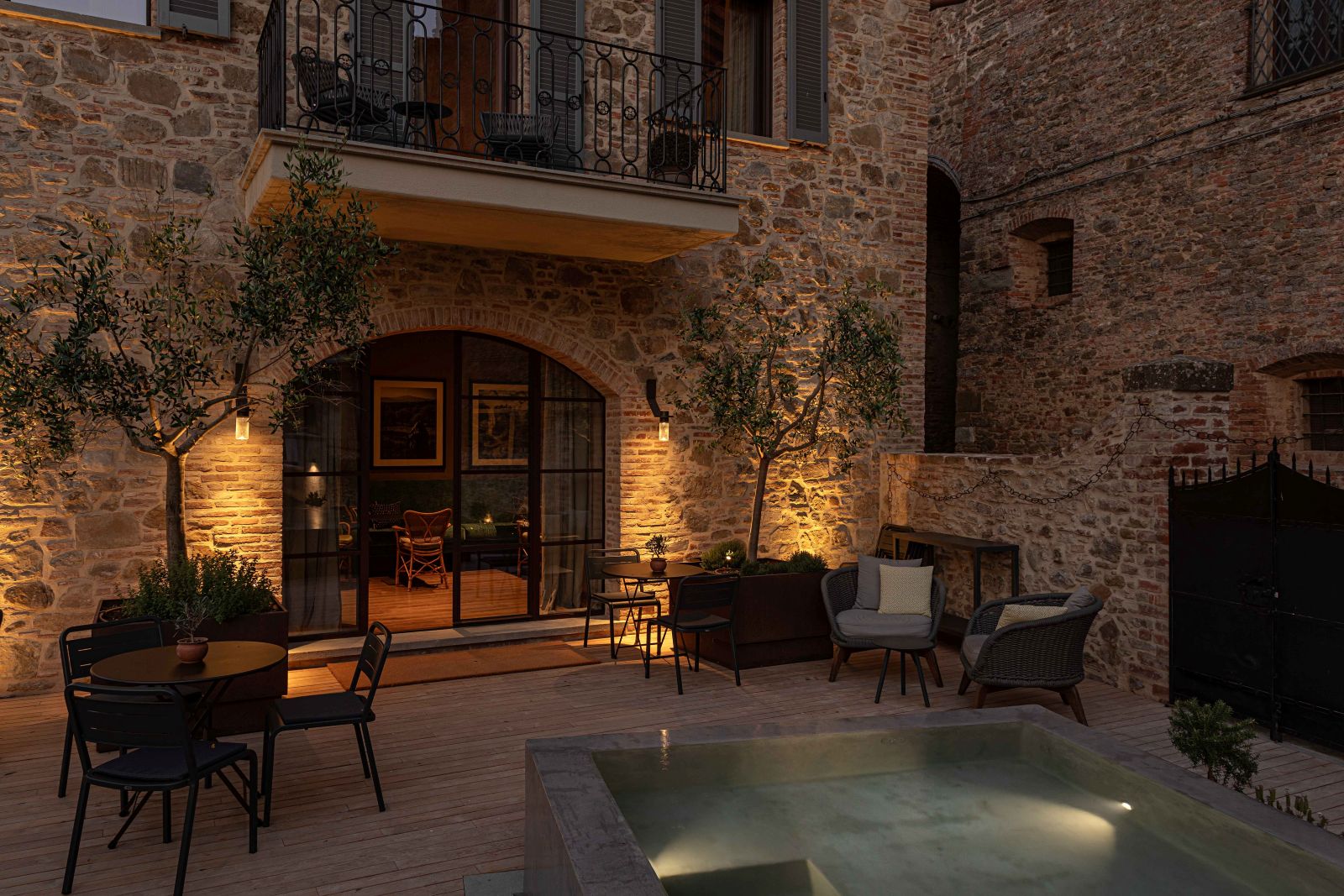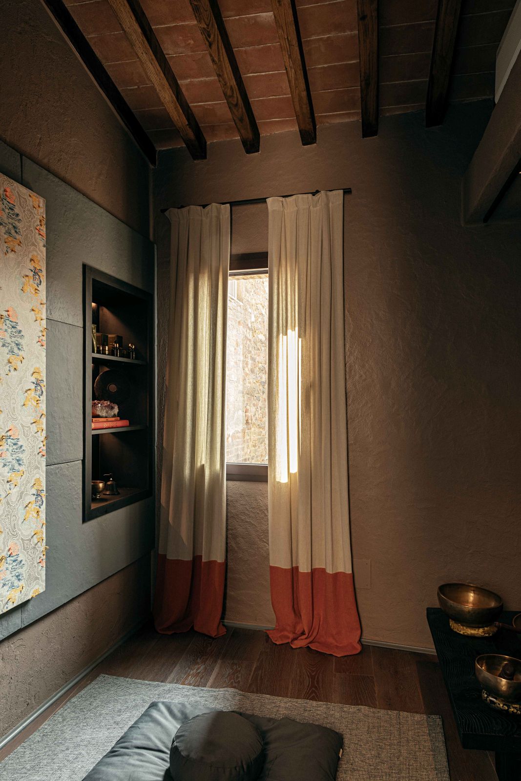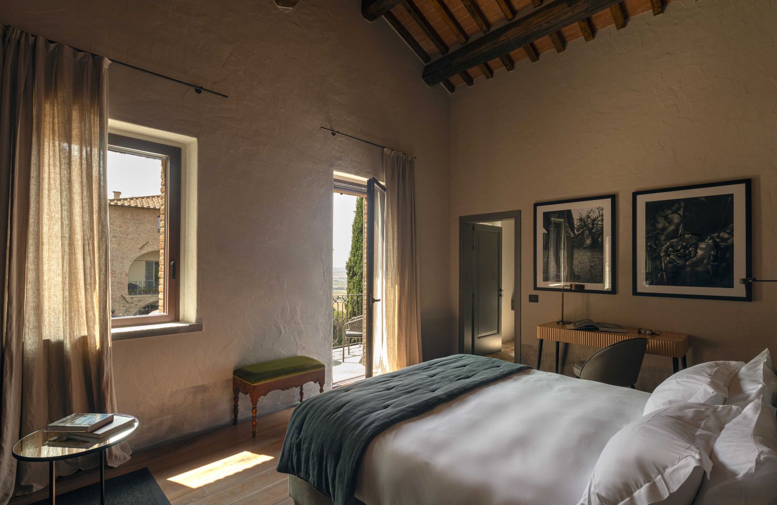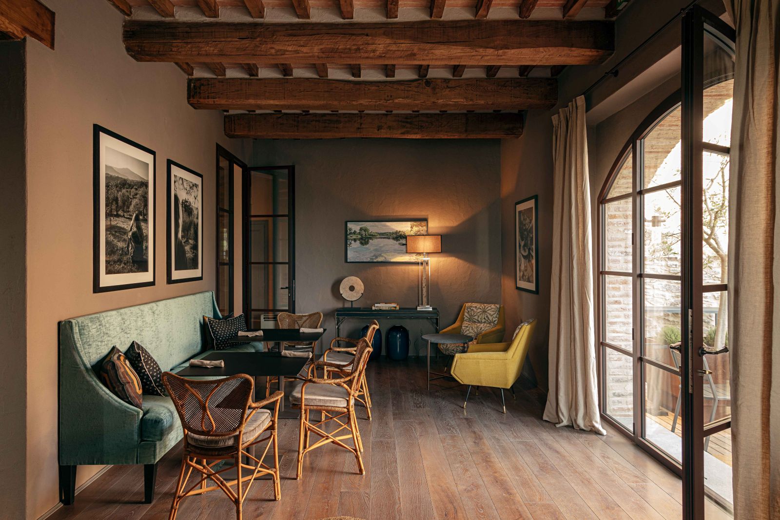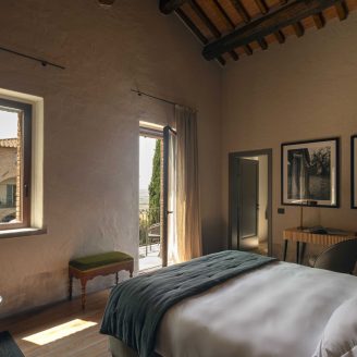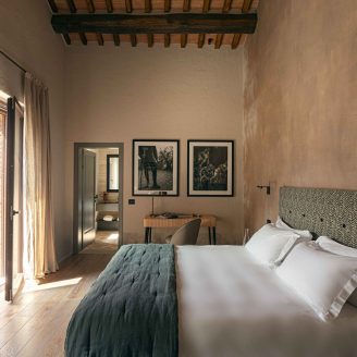 Gli interni dell’hotel si distinguono per pareti insonorizzate dai colori polverosi che si affacciano su finestre schermate da tessuti nei colori dei mattoni tipici del borgo; cromie che si ritrovano nelle aree comuni, accostandosi armoniosamente ai vecchi gradini e ai portali in pietra Serena.