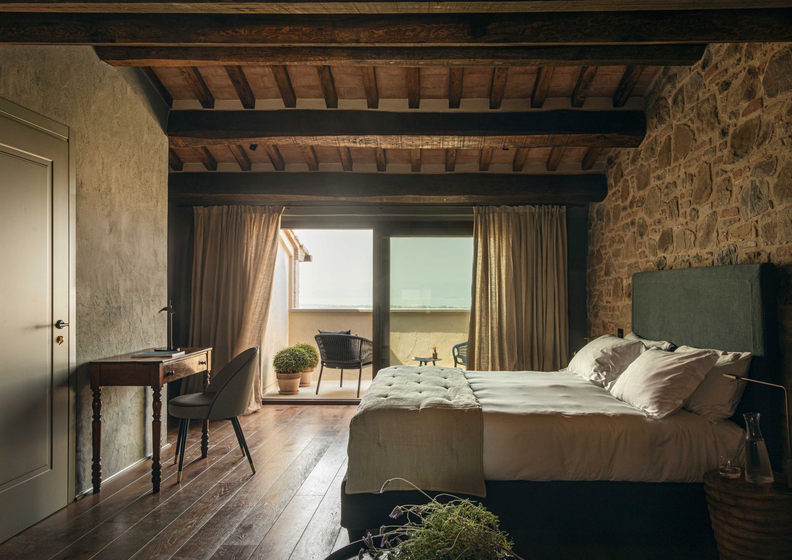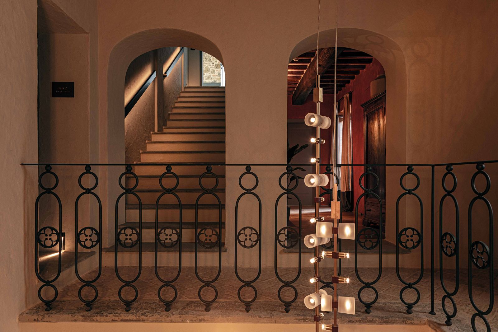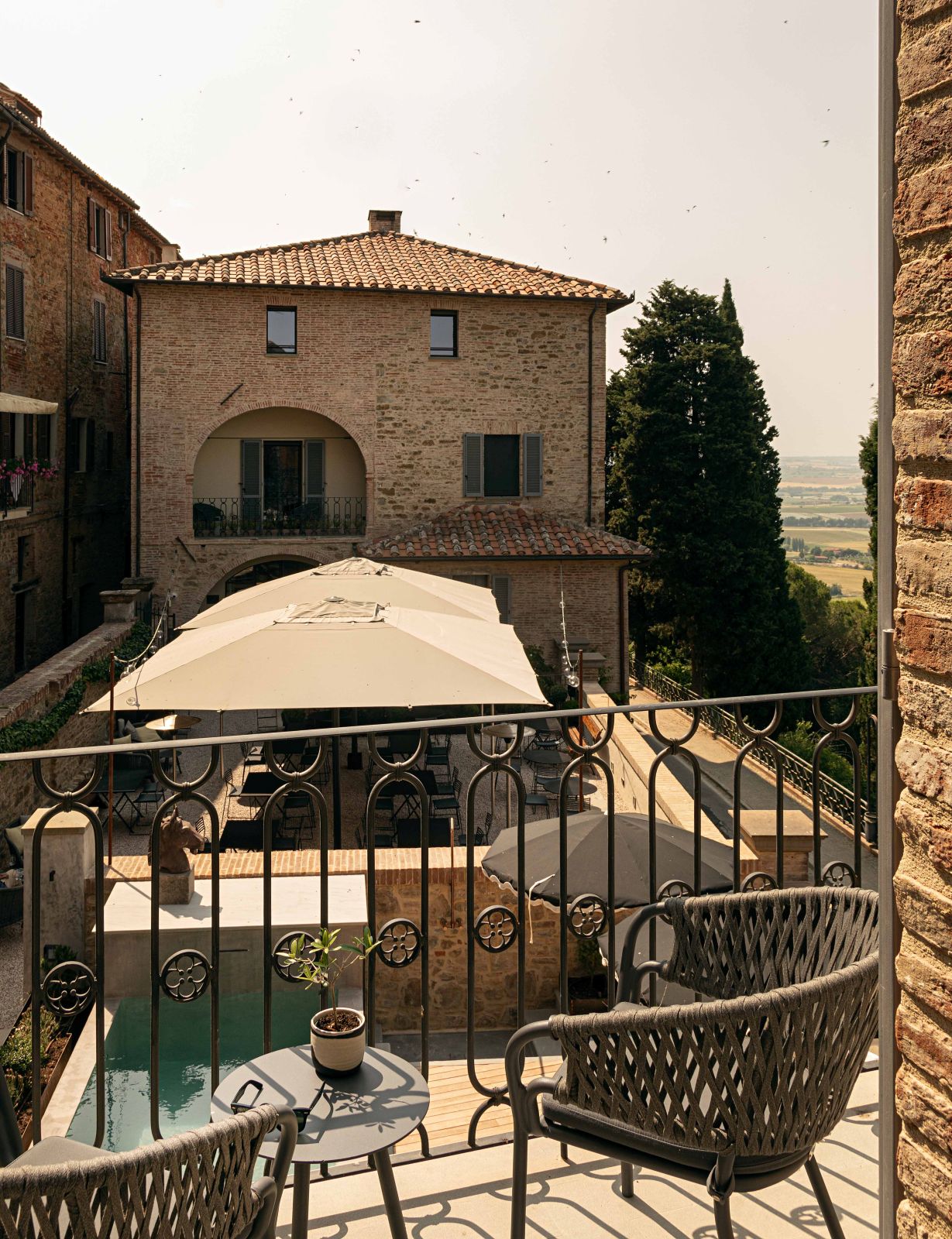 Gli interni dell’hotel si distinguono per pareti insonorizzate dai colori polverosi che si affacciano su finestre schermate da tessuti nei colori dei mattoni tipici del borgo; cromie che si ritrovano nelle aree comuni, accostandosi armoniosamente ai vecchi gradini e ai portali in pietra Serena.