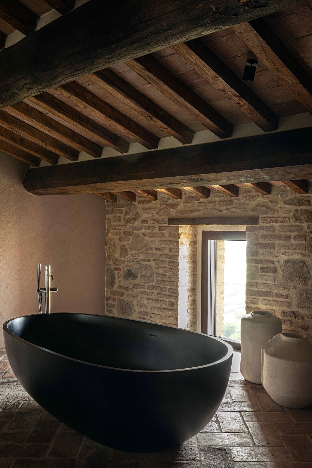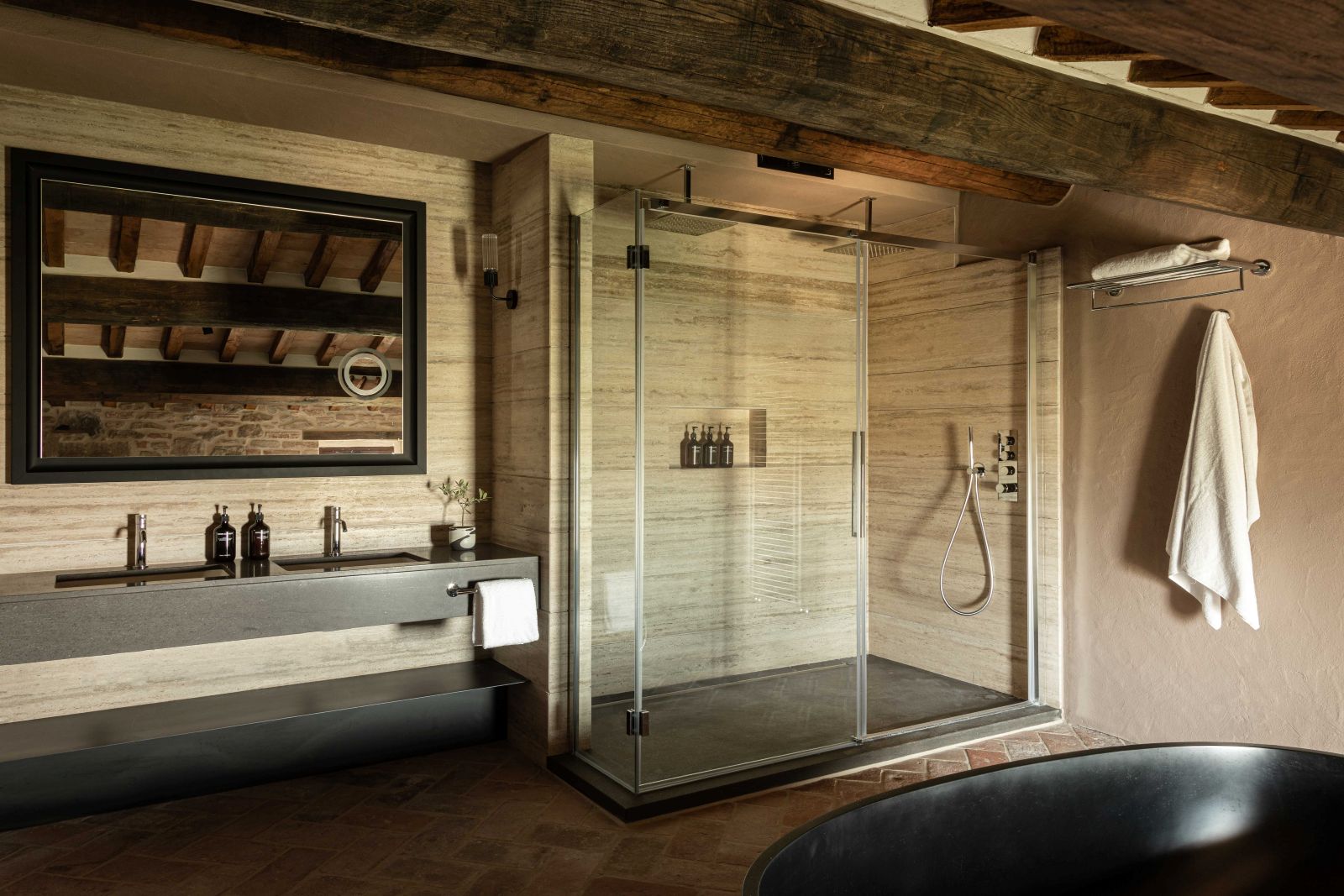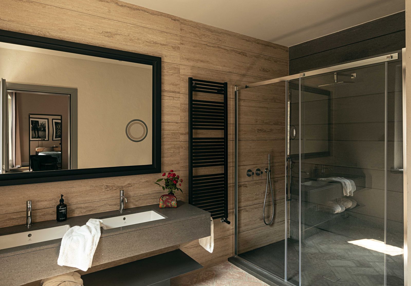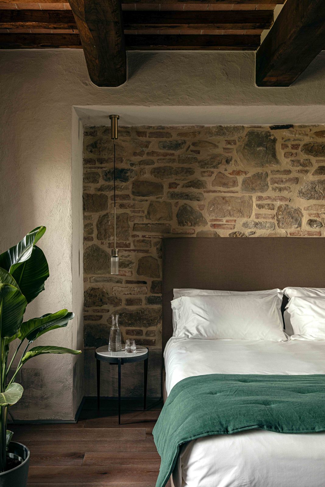 Gli interni dell’hotel si distinguono per pareti insonorizzate dai colori polverosi che si affacciano su finestre schermate da tessuti nei colori dei mattoni tipici del borgo; cromie che si ritrovano nelle aree comuni, accostandosi armoniosamente ai vecchi gradini e ai portali in pietra Serena.