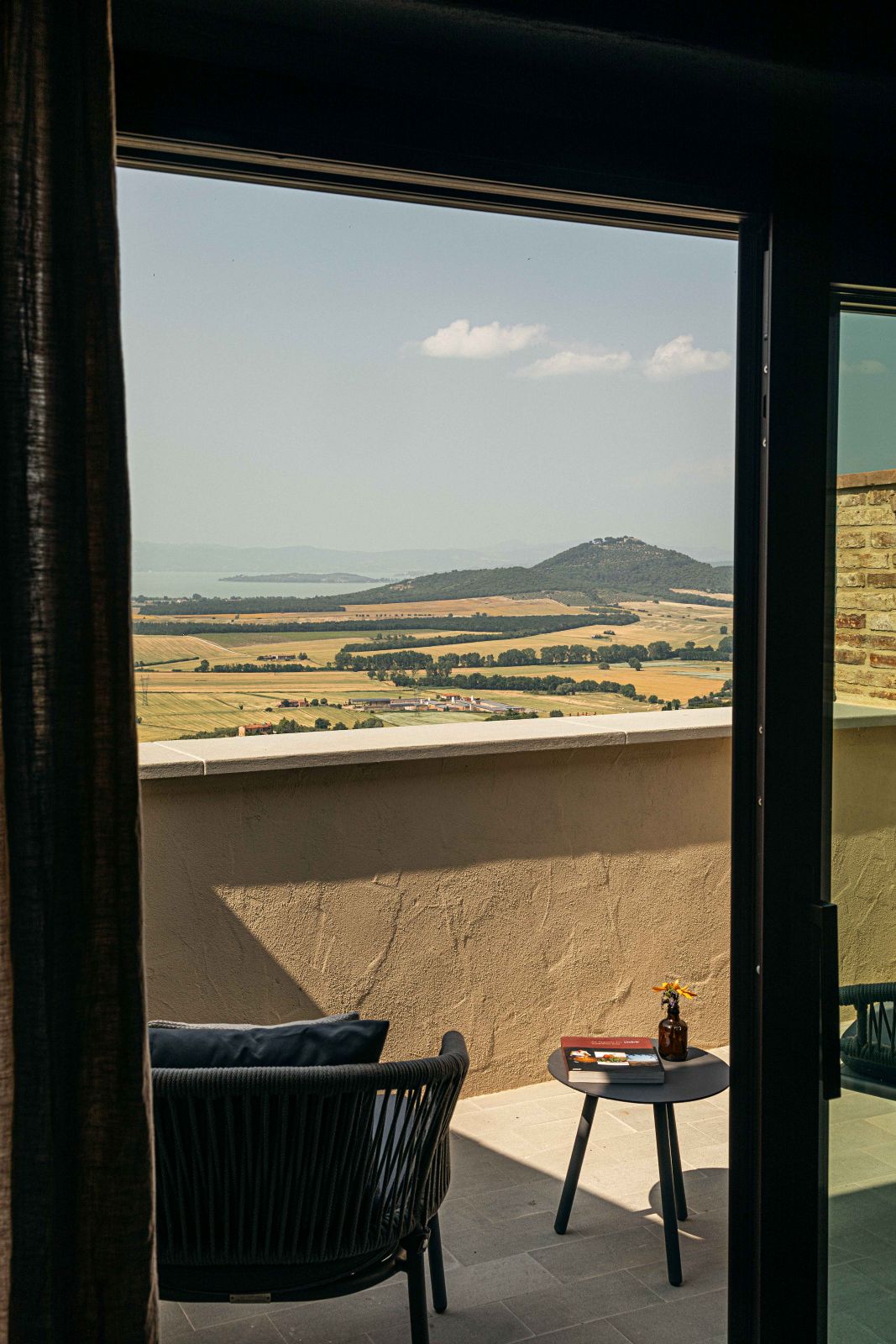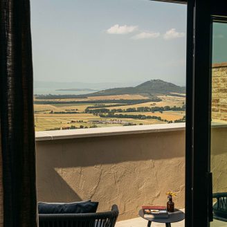 Questo spazio verde appare come sospeso nel tempo, offrendo una vista mozzafiato sul Lago Trasimeno, circondato da colori che sembrano rubati a un dipinto del Perugino. Tutta la disposizione degli ambienti segue un concetto di rigorosa continuità visiva, con schermi quasi impercettibili che puntano a creare un unicum fluido tra l’interno e l’esterno. Con questo intervento, Pelizzari Studio ha proseguito il percorso di compenetrazione tra la struttura ricettiva e il suo luogo d’origine, operando sottotraccia con le necessarie integrazioni tecnologiche per restituire un equilibrio di rara suggestione.