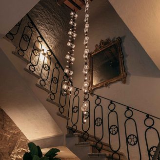 L’ingresso principale, davanti allo scalone originale del palazzo, lascia senza fiato grazie alla scenografica installazione di Viabizzuno che collega, illuminando, i vari piani.