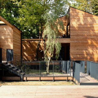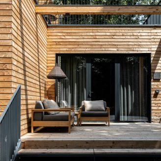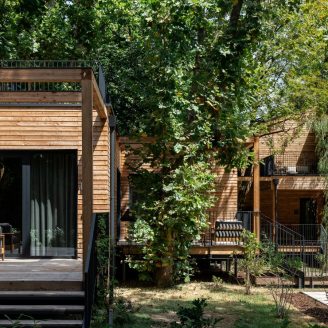 Il progetto prevede sette suite inserite in quattro volumi a palafitta in legno, che si raccordano tra loro grazie a un sistema sollevato di rampe, passerelle e terrazze accessibili e include una villa storica recuperata. 160 micropali sostengono le nuove costruzioni e gli spazi esterni, per rispettare le radici degli alberi secolari, integrati direttamente negli edifici dopo un’attenta mappatura e resi visibili all’interno attraverso sistemi a vetrata.