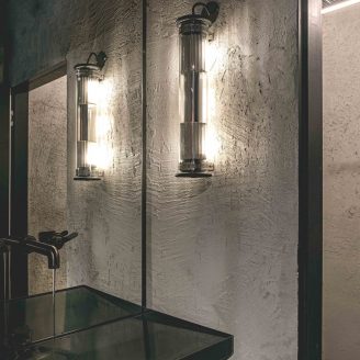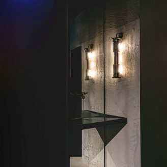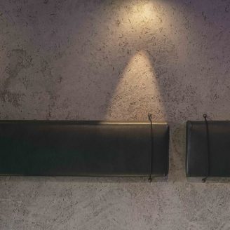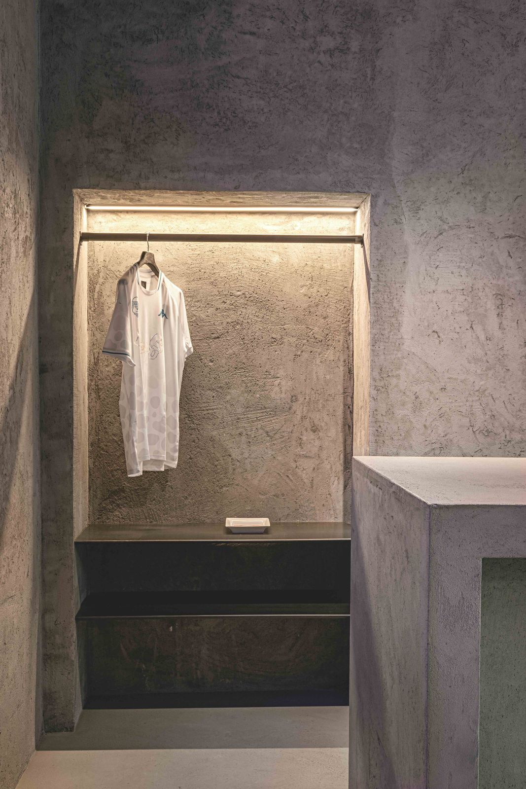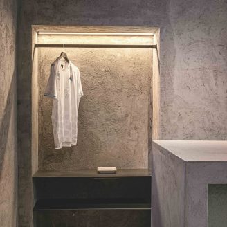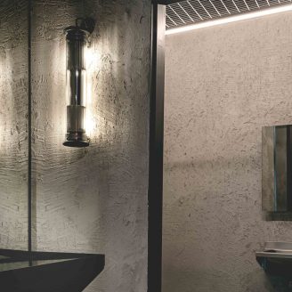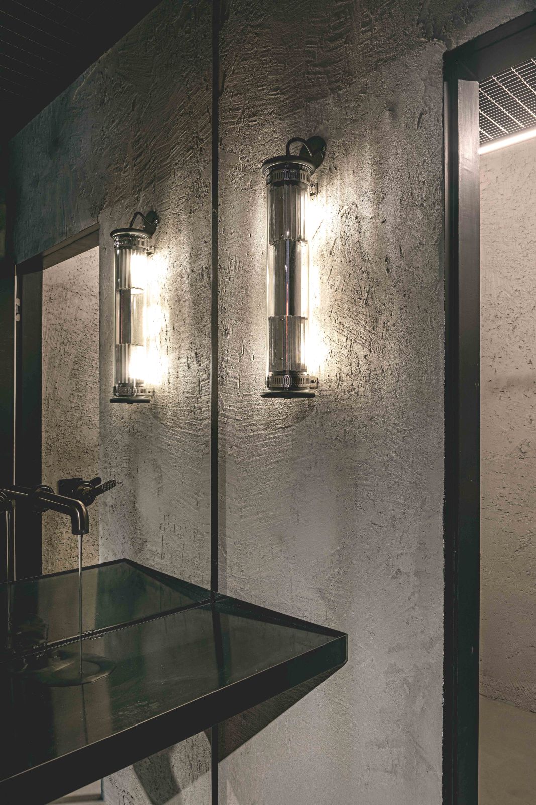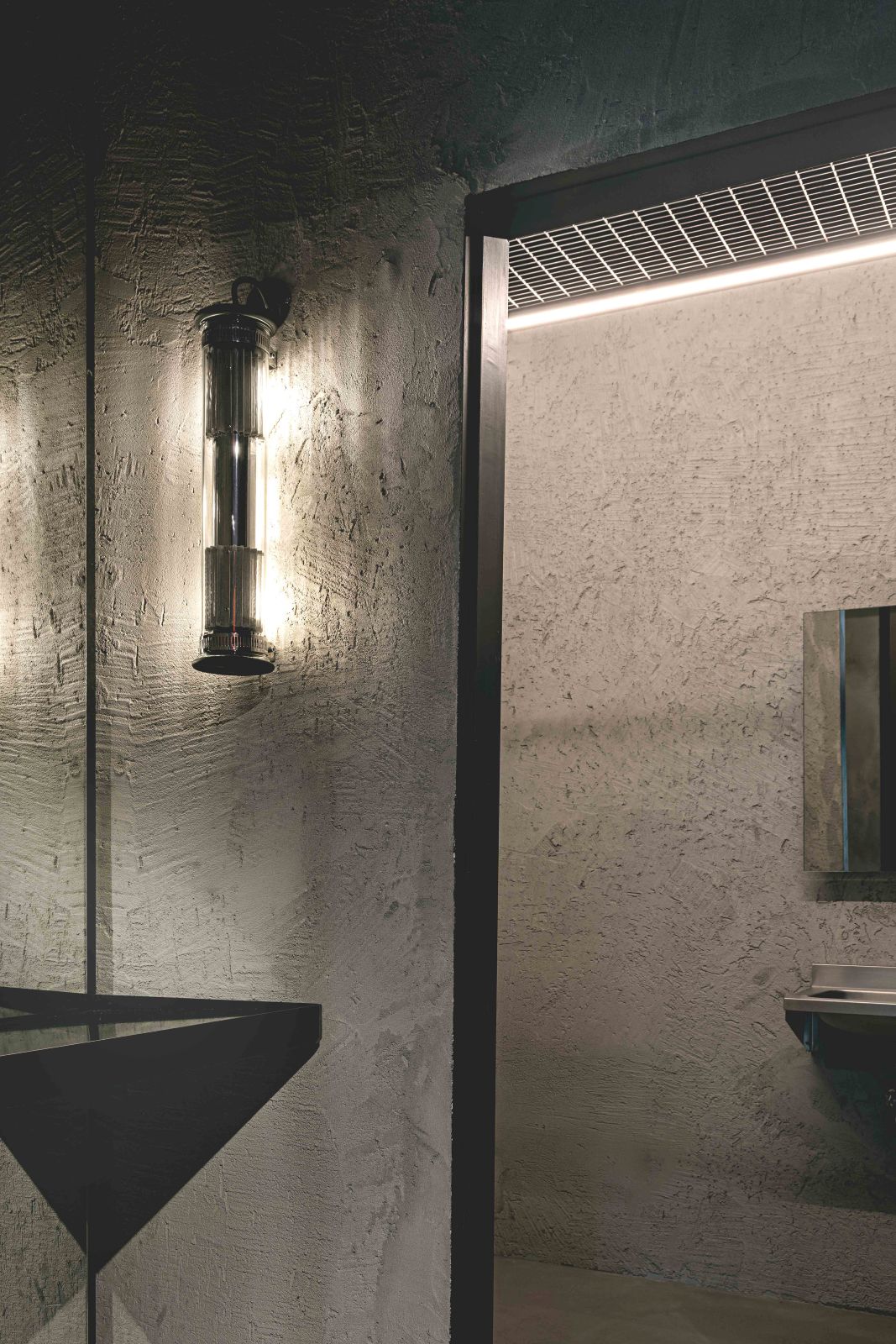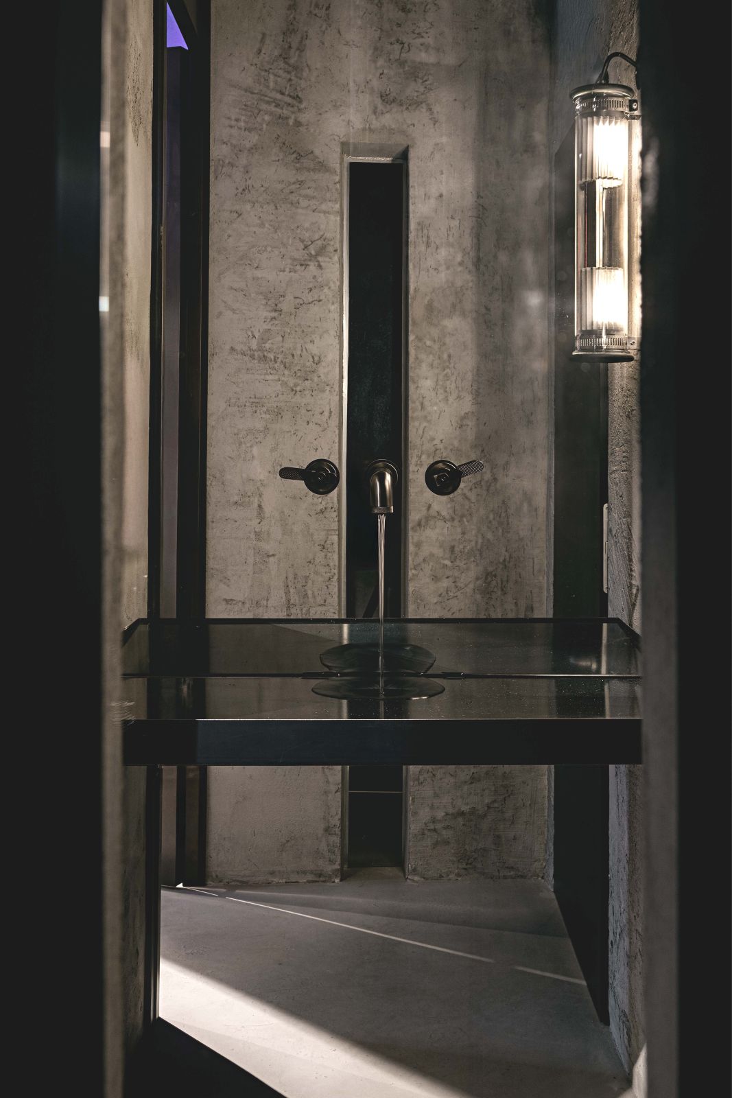 L’illuminazione ponderata crea contrasti profondi, mentre dettagli come il lavabo in ferro naturale e il controsoffitto forato che mostra gli impianti accentuano l’anima industrial. Una fessura vetrata offre infine uno sguardo intimo sulla cucina, alludendo a una Milano urbana e sincera dove la materia diventa racconto.