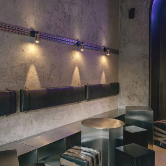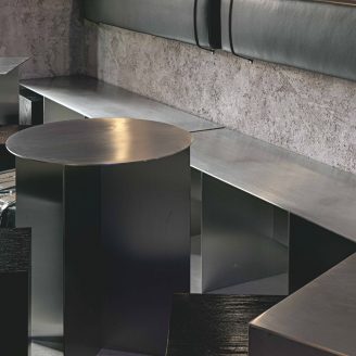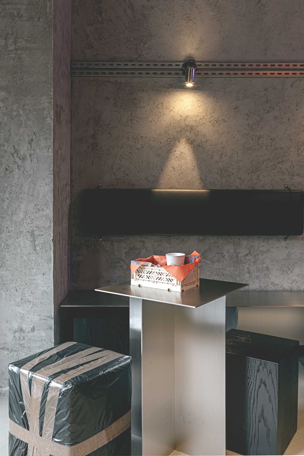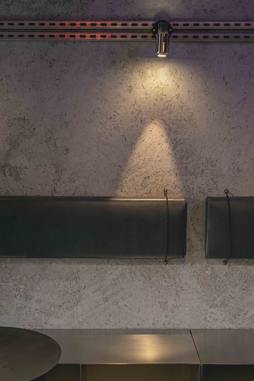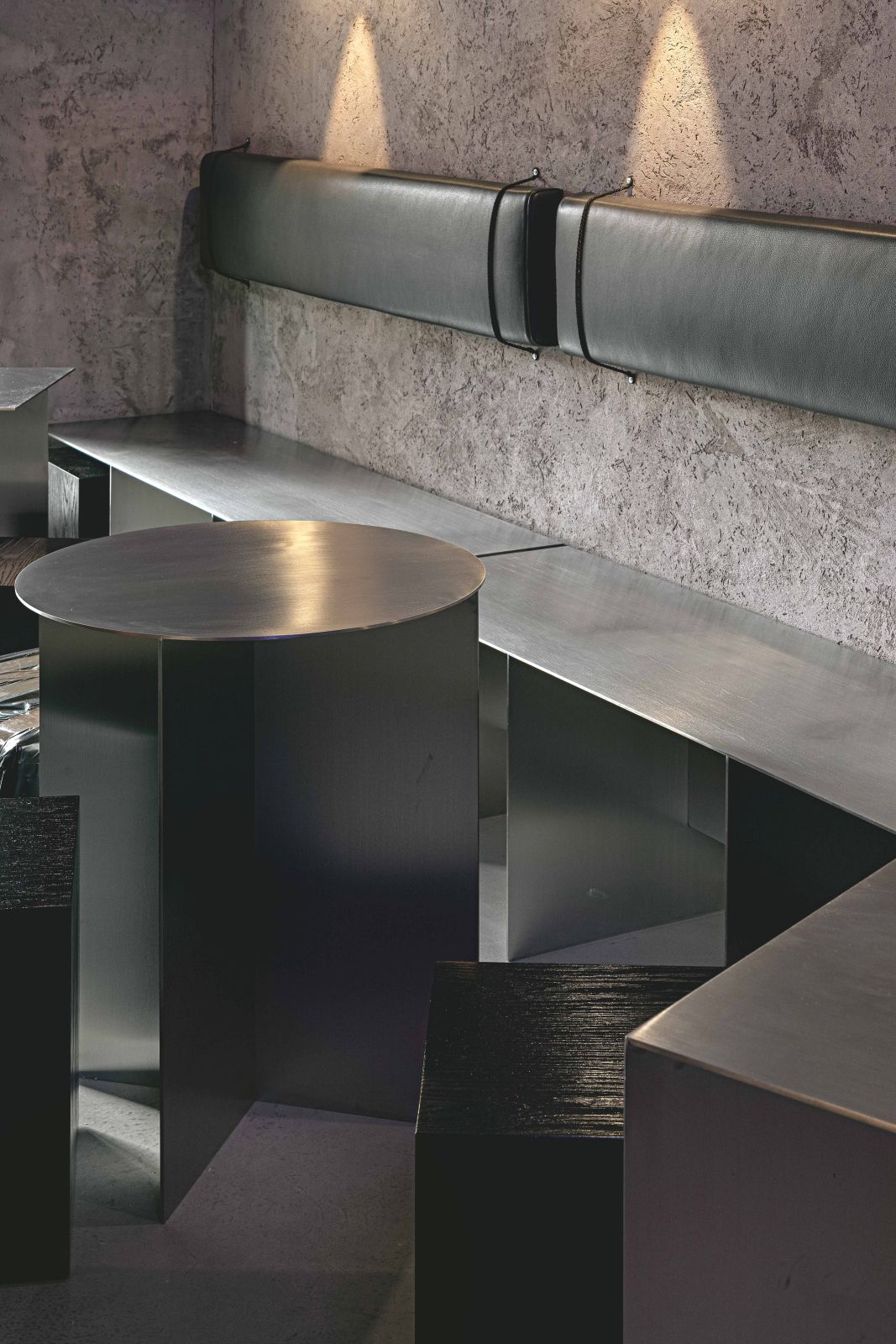 L’identità del locale è definita da elementi monumentali: un bancone monolitico e un arco brunito alto quattro metri che domina la scena come un portale teatrale. L’arredo, interamente custom, include una lunga panca modulare in acciaio inox con cuscini in pelle sospesi tramite corde e una serie di tavolini in acciaio dalle forme irregolari. Una nota ironica e provocatoria è data dagli sgabelli, alcuni dei quali rivestiti con sacchi della spazzatura e nastro da pacchi. La flessibilità è fondamentale: gli arredi possono essere riposti sotto la panca per trasformare la sala in occasione di eventi.