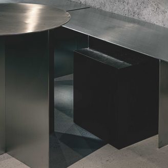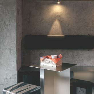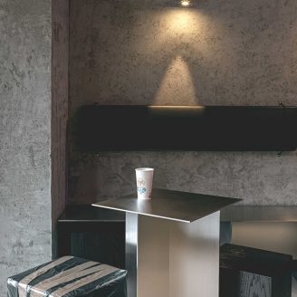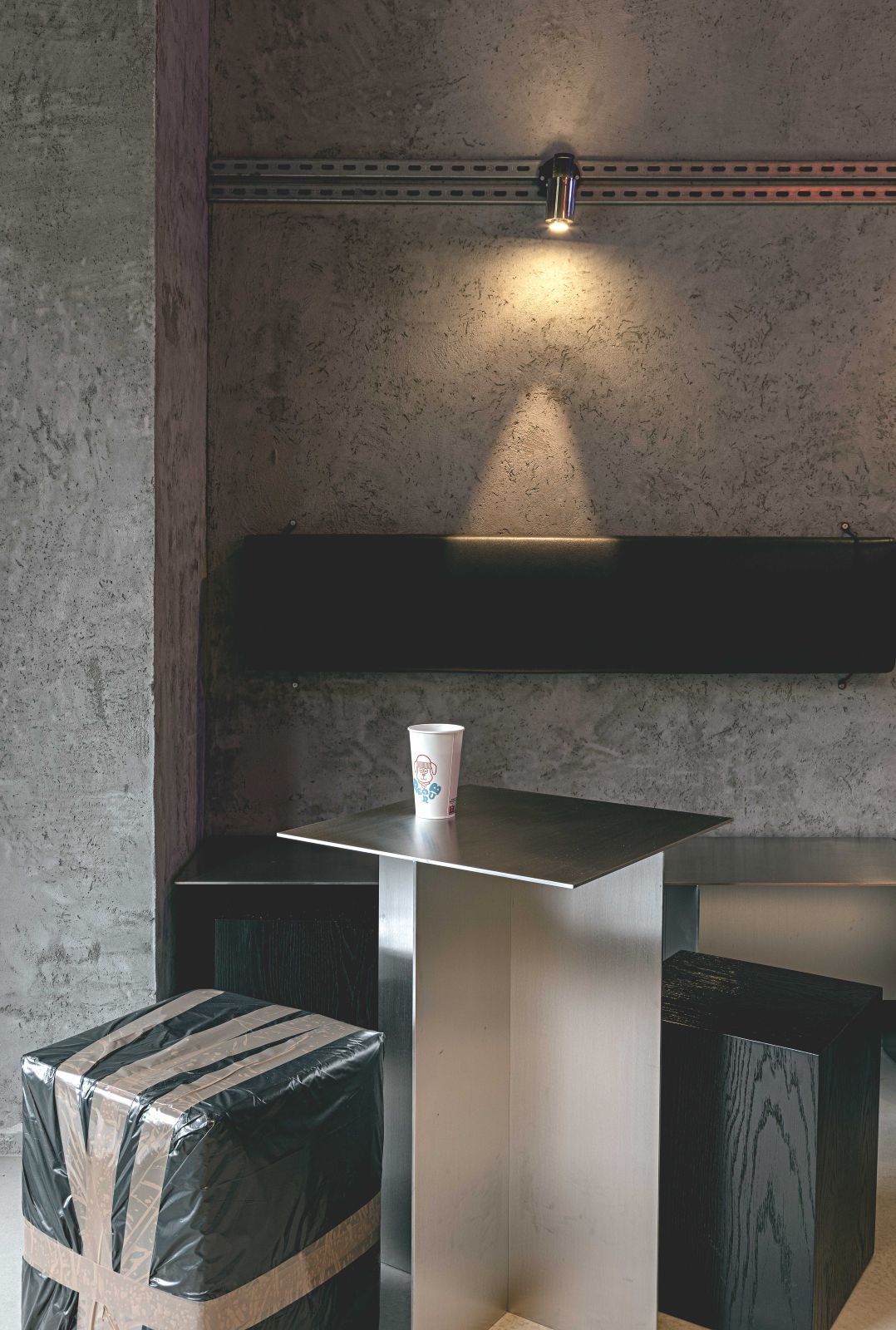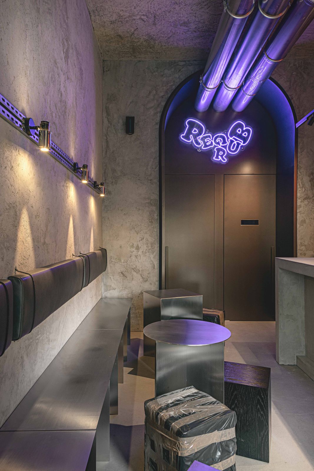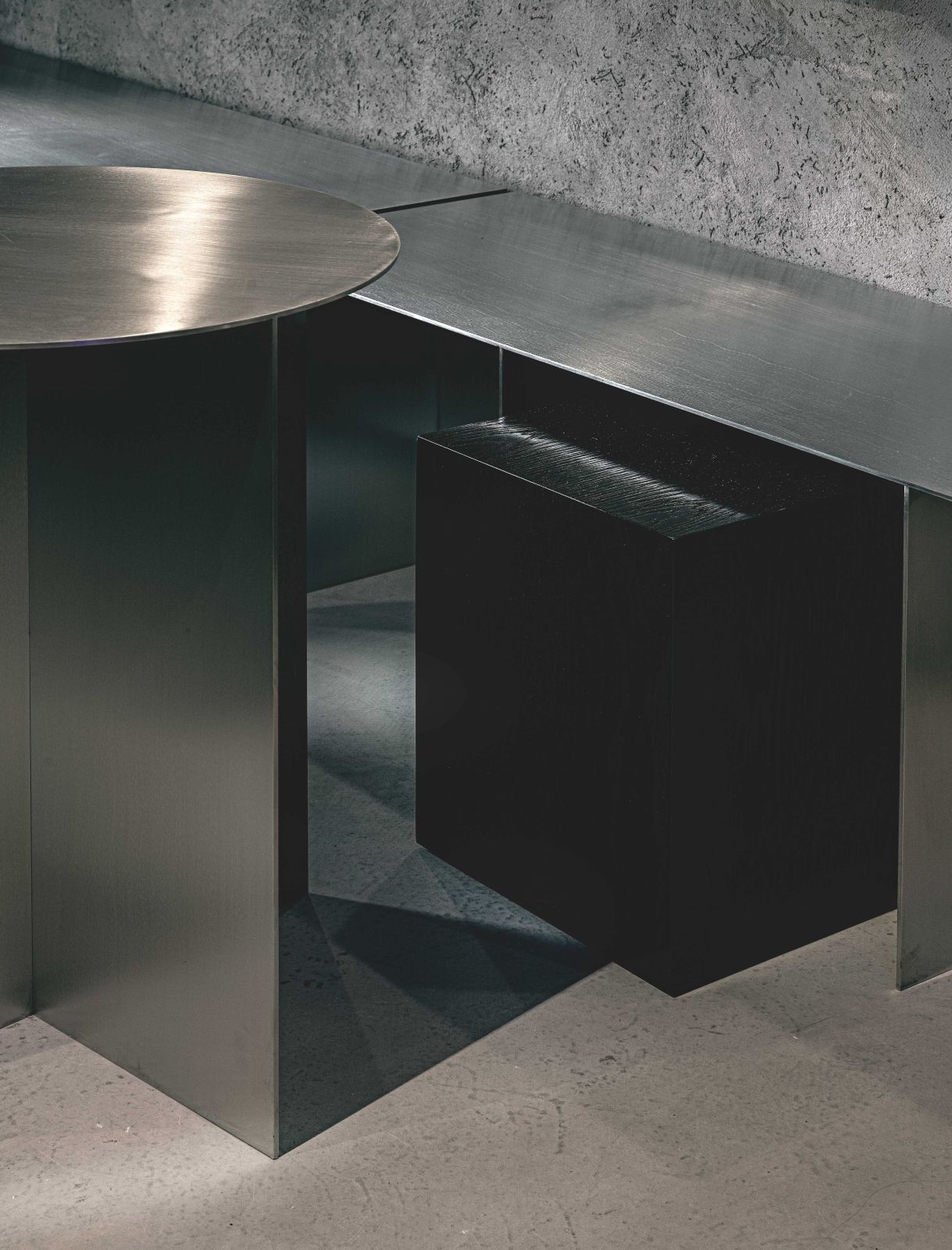 L’identità del locale è definita da elementi monumentali: un bancone monolitico e un arco brunito alto quattro metri che domina la scena come un portale teatrale. L’arredo, interamente custom, include una lunga panca modulare in acciaio inox con cuscini in pelle sospesi tramite corde e una serie di tavolini in acciaio dalle forme irregolari. Una nota ironica e provocatoria è data dagli sgabelli, alcuni dei quali rivestiti con sacchi della spazzatura e nastro da pacchi. La flessibilità è fondamentale: gli arredi possono essere riposti sotto la panca per trasformare la sala in occasione di eventi.