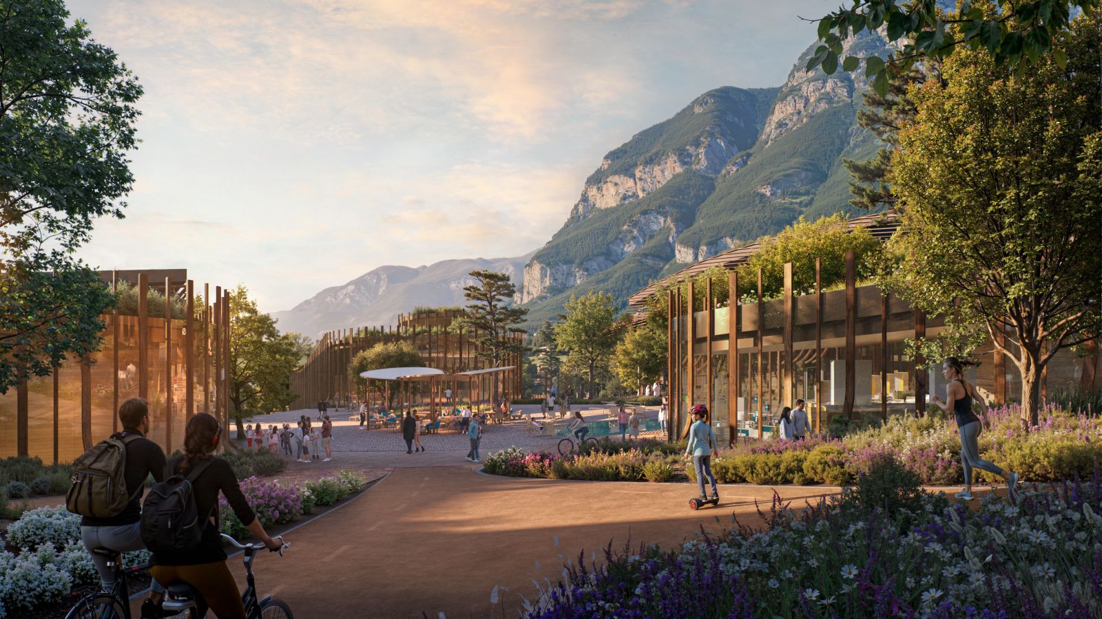 Dal punto di vista architettonico, il progetto nasce dall’idea di “estrudere il terreno trasformandolo in architettura abitata,” seguendo la naturale pendenza del sito. I volumi sono rivestiti con doghe di legno e presentano tetti verdi accessibili, concepiti come giardini pensili e spazi di socialità. Andrea Dal Negro, architetto di NOA, spiega che gli edifici variano in altezza per preservare le viste panoramiche e sono orientati per massimizzare luce naturale e ventilazione.