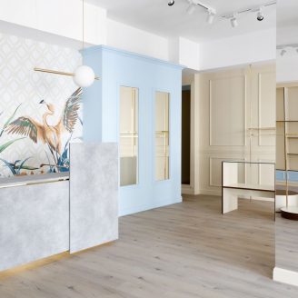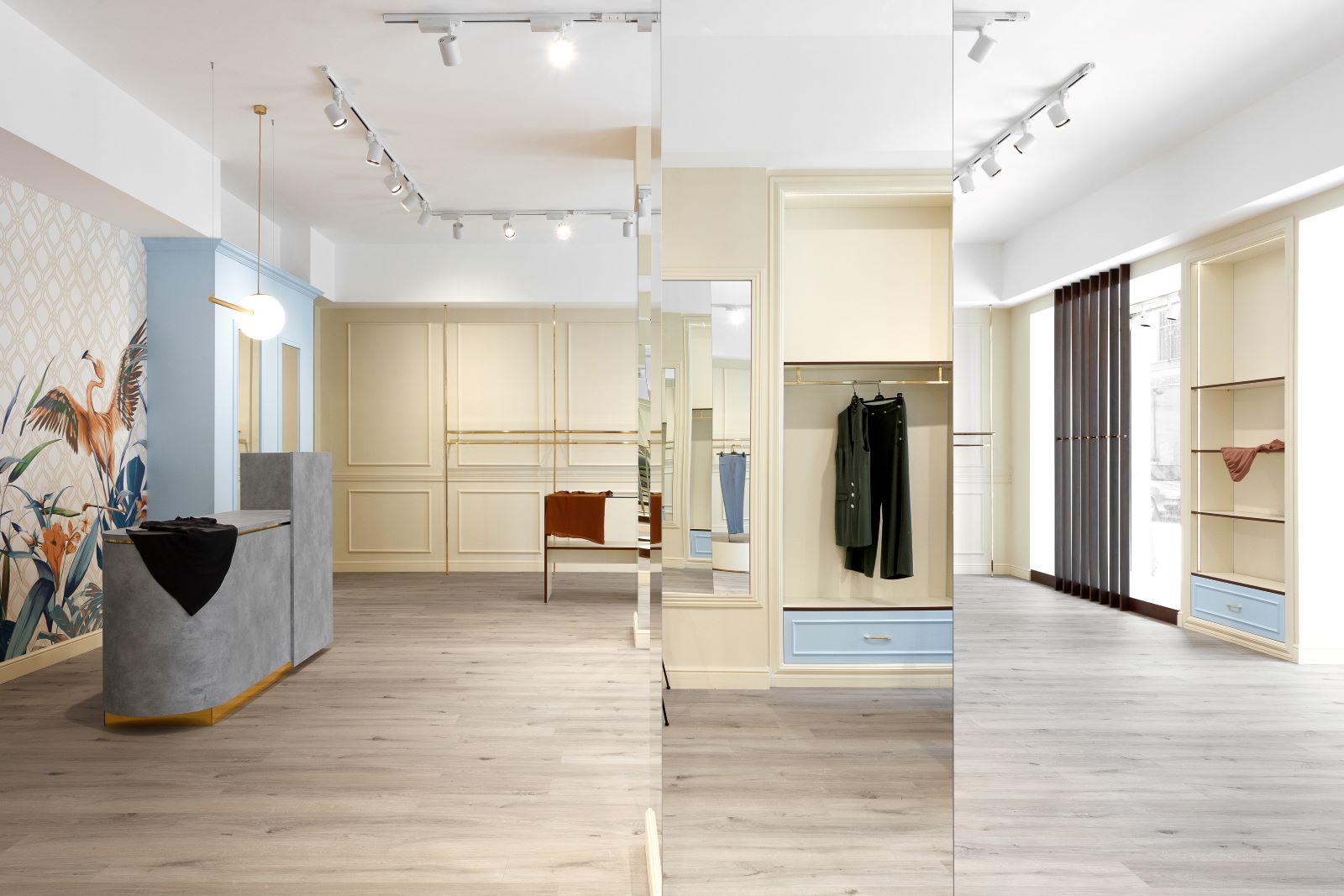All’interno dello store è stato creato uno spazio esclusivo per i capi di alta moda firmati, che si distingue dalle altre aree espositive grazie a una pannellatura a tutta parete definita da una struttura cromata in oro che dona luminosità e impreziosisce l’intero ambiente. Questa scelta crea una silhouette molto minimale ispirata alla leggerezza delle membra del fenicottero che compare sulla carta da parati della zona casse.