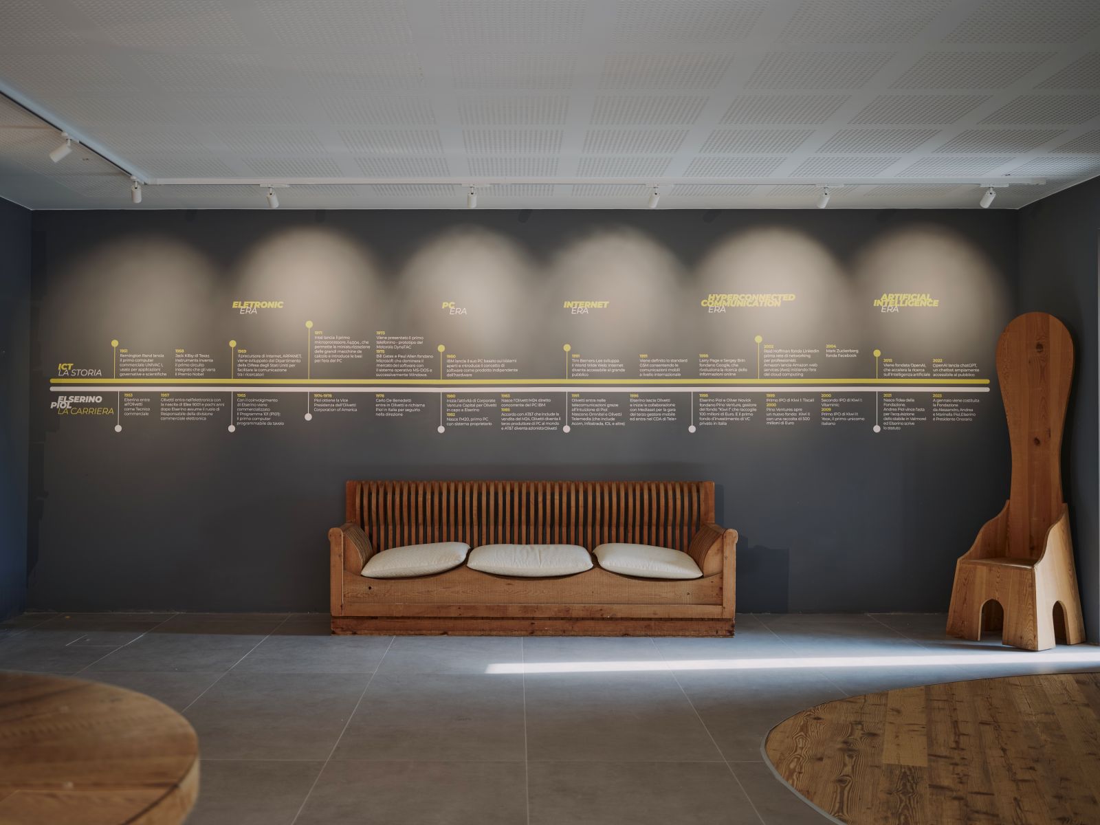 All’interno del piano seminterrato, la progettazione degli spazi riflette la personalità dinamica e l’energia di Elserino Piol attraverso l’uso di una palette cromatica contrastante di giallo e grigio, colori che traducono spazialmente i concetti di vivacità e innovazione. Gli ambienti, organizzati in un open space multifunzionale, ospitano aree di coworking pensate per favorire interazione e sviluppo di nuove idee, un percorso visivo sui momenti chiave della vita di Piol, e la sua biblioteca storica trasferita da Milano. Infine il progetto è fortemente incentrato sulla sostenibilità ambientale, integrando soluzioni tecnologiche all’avanguardia: dalla scelta dei materiali naturali come legno e pietra, all’utilizzo di energie rinnovabili, tra cui un impianto a biomassa per la produzione di calore, sistemi di contenimento energetico e impianto fotovoltaico.