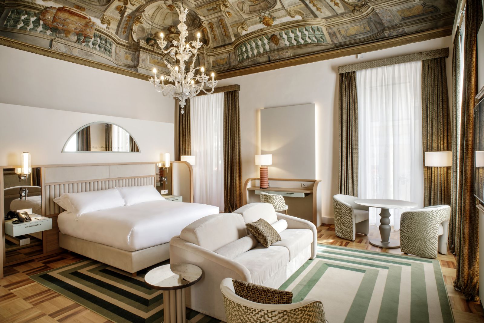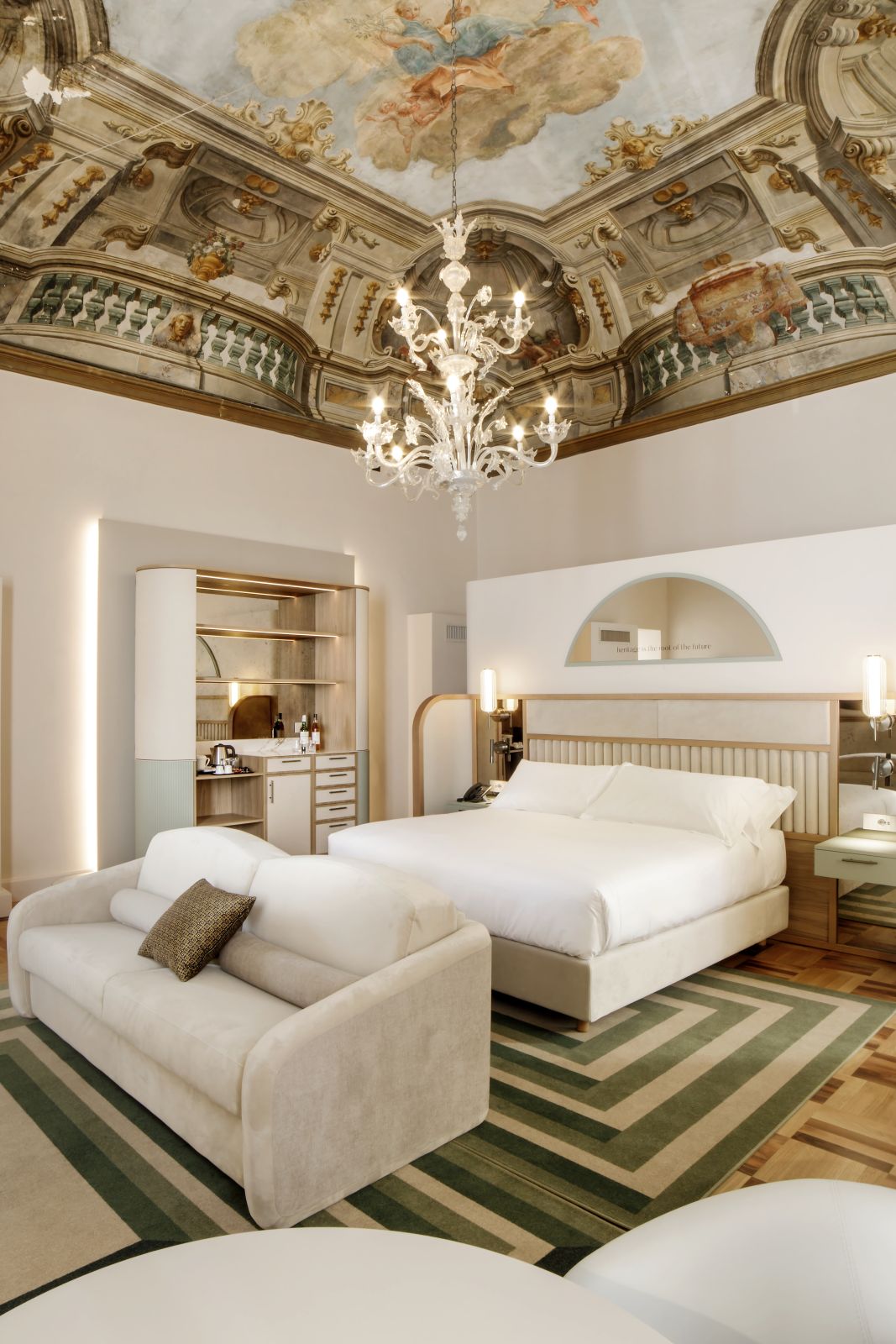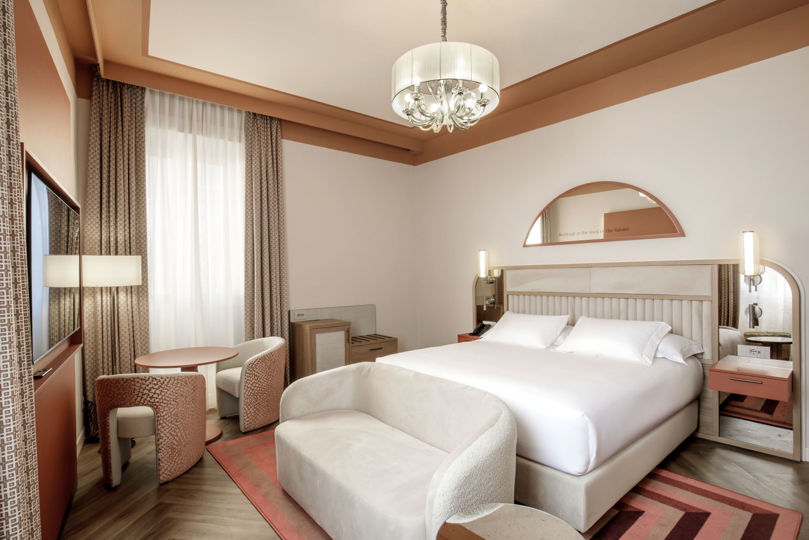 Le 70 camere sono caratterizzate da un dettaglio iconico: una riproduzione lignea della formella del Duomo accompagnata da cioccolatini di benvenuto. Sulle testate dei letti, disegnate da ovre.design e realizzate dalla falegnameria Vitaloni, campeggia la frase: “Heritage is the root of the future”.