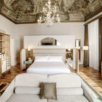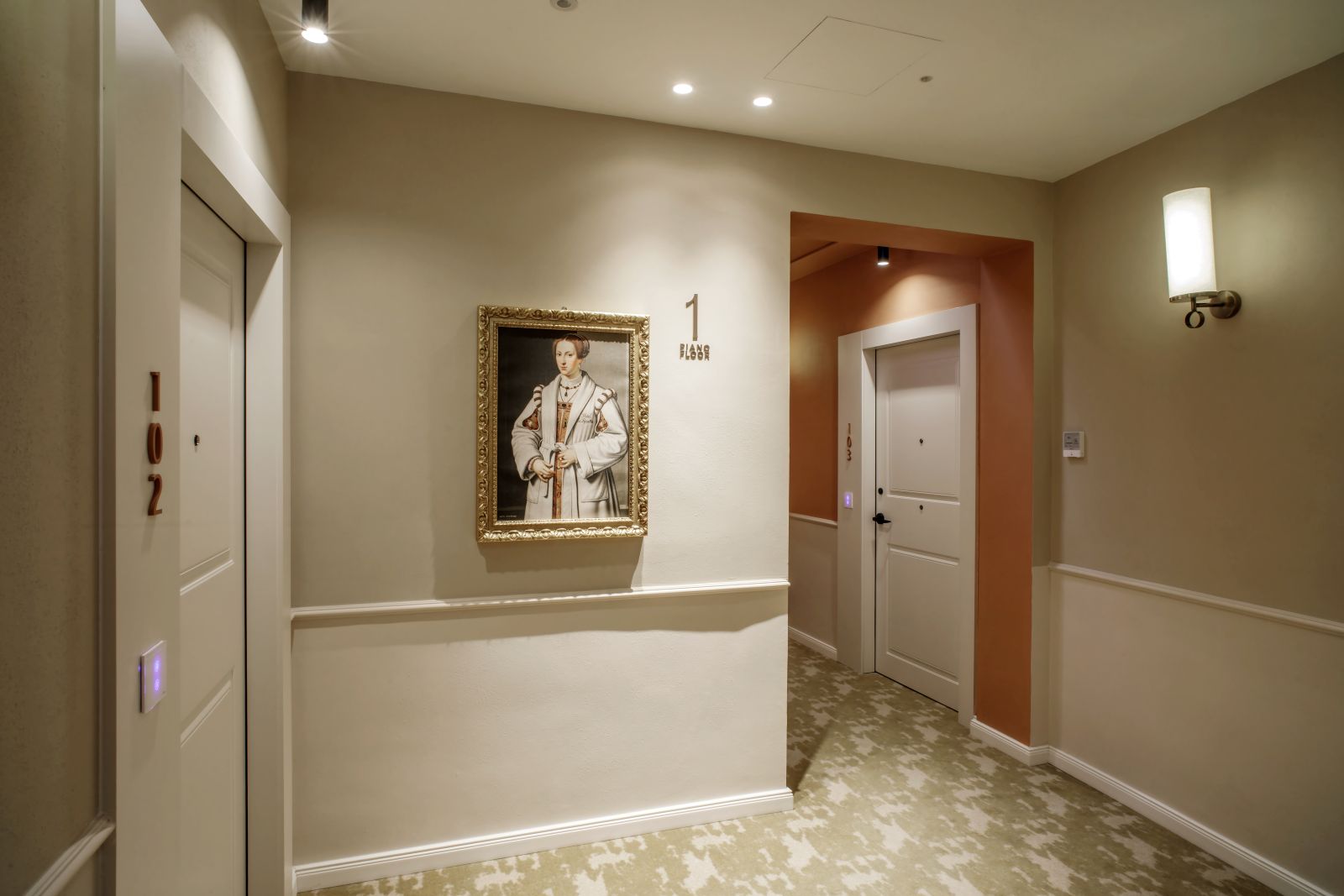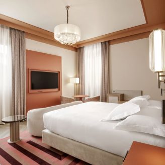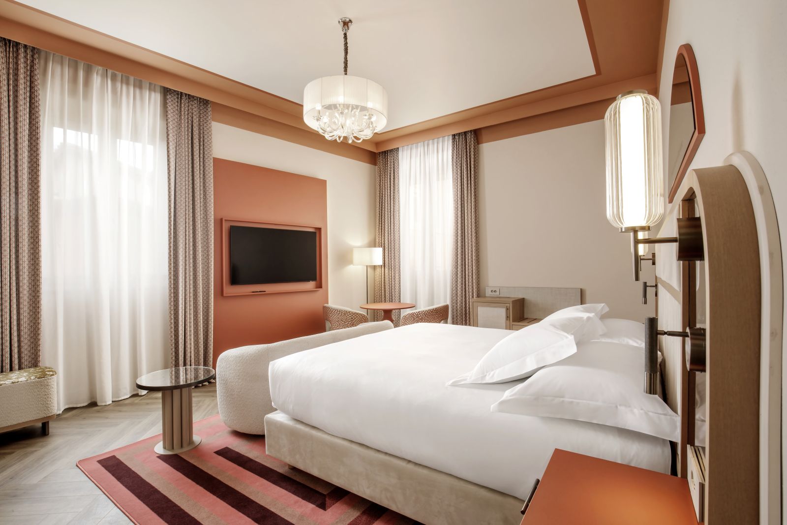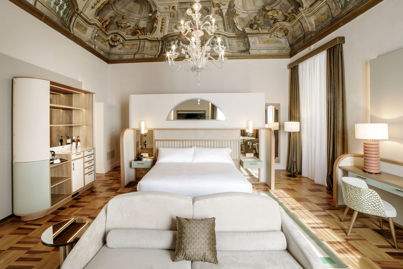 Le 70 camere sono caratterizzate da un dettaglio iconico: una riproduzione lignea della formella del Duomo accompagnata da cioccolatini di benvenuto. Sulle testate dei letti, disegnate da ovre.design e realizzate dalla falegnameria Vitaloni, campeggia la frase: “Heritage is the root of the future”.