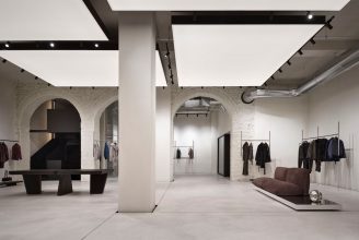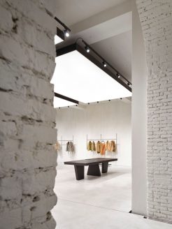 Il progetto costruisce un dialogo calibrato tra memoria e contemporaneità: se gli archi in mattoni e le superfici materiche evocano l’anima storica dell’edificio, i controsoffitti geometrici e le canalizzazioni a vista introducono un linguaggio industriale moderno. Un ruolo centrale è affidato alla luce scenografica dei pannelli Dresswall, che diffondono un’illuminazione morbida ideale per valorizzare le texture e le cromie delle pelli. L’atmosfera invita a una fruizione lenta e consapevole, riflettendo un approccio “slow fashion” che celebra la qualità artigianale e l’esclusività tipiche di Salvatore Santoro.