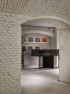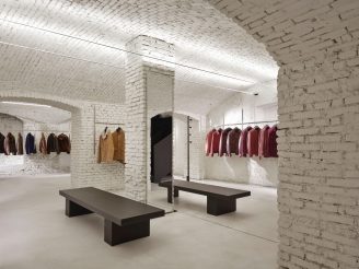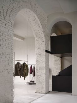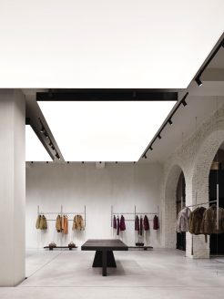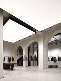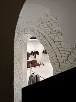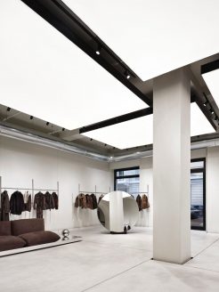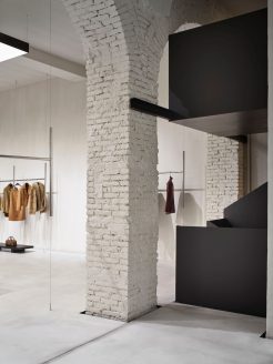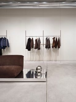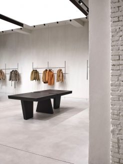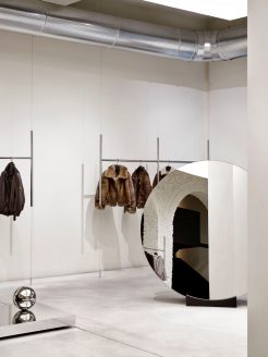 All’interno di questo raffinato “white cube“, gli arredi trascendono la funzione espositiva per trasformarsi in presenze scultoree. Le appenderie flottanti in acciaio lucido, i tavoli monolitici in rovere scuro (su disegno di P+F) e il grande specchio circolare assumono il valore di pezzi unici. L’allestimento è completato da elementi di design come il divano Baxter firmato da Hannes Peer.