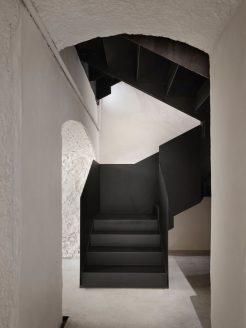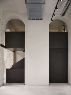 Il concept architettonico si fonda su tre gesti primari che definiscono l’identità del luogo: la pavimentazione in cemento, concepita come una piattaforma autonoma che si distacca dalle pareti originali; una scala in metallo nero dalla geometria rigorosa che funge da segno grafico di connessione; e grandi plafoni luminosi che introducono una dimensione eterea, amplificando la percezione volumetrica degli ambienti. Questa struttura esprime una chiarezza formale che traduce nello spazio la forza materica del marchio.