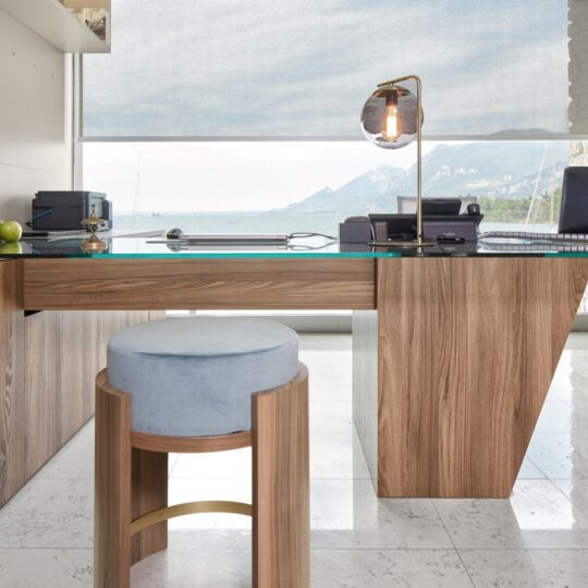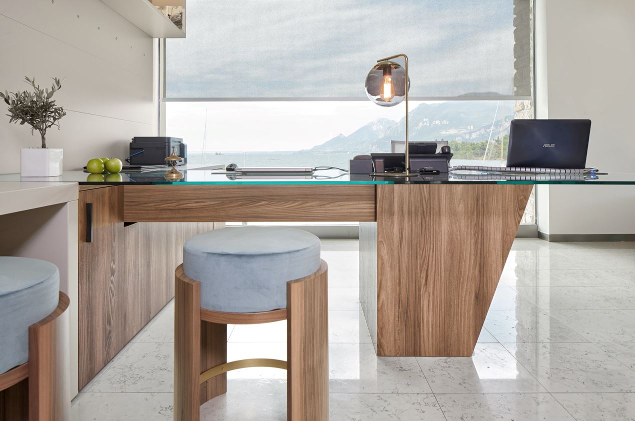La firma di ovre.design comincia all’ingresso nella hall. L’idea era quella di far godere della bellissima vista lago gli ospiti sin dalla loro attesa in reception. Una hall studiata nel dettaglio con welcome table, eleganti pouf e poltroncine in velluto, dove design e qualità creano un accogliente spazio di benvenuto. La zona ufficio è stata trasformata in un’area di design che comprende un merchandising di complementi d’arredo e articoli d’abbigliamento disegnati da ovre.design, in un progetto coordinato portato avanti con aziende di prim’ordine e con le collaborazioni di artigiani specializzati.