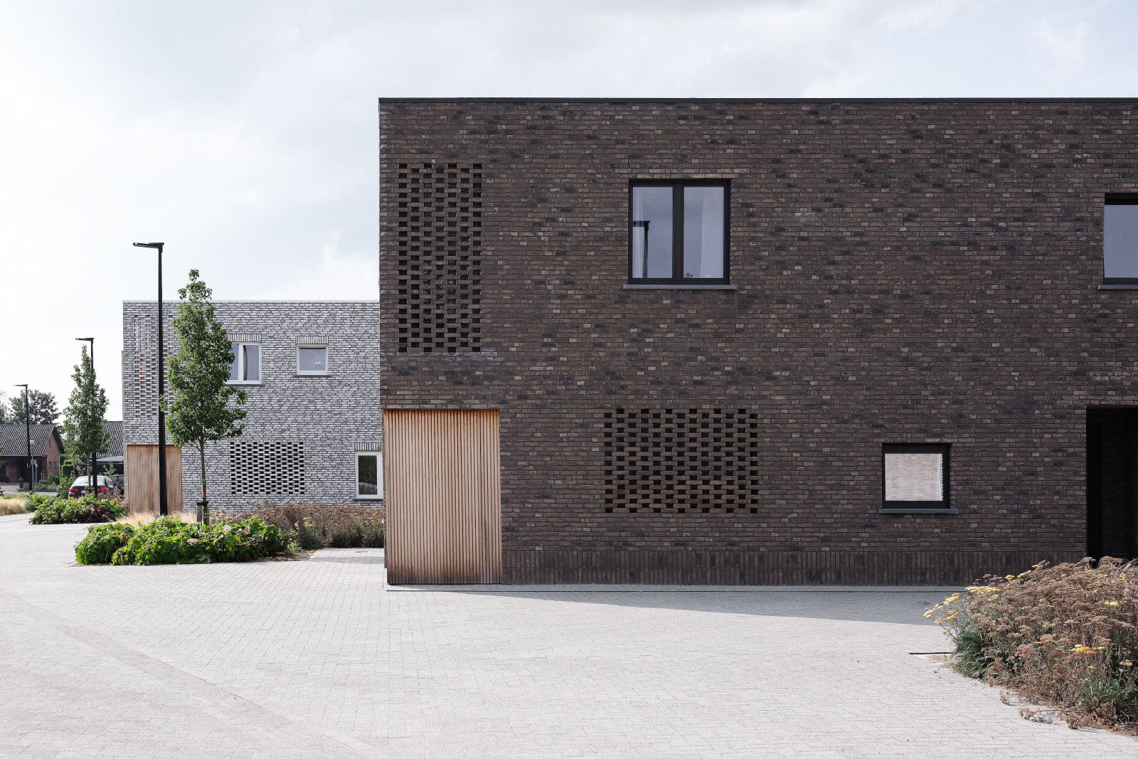 Le case, compatte e dal tetto piano, sono realizzate con mattoni faccia a vista, una soluzione tipica e ancora ampiamente usata in ambito locale che Studio Farris ha composto ricorrendo a diversi impasti e colori così da dare luogo a leggere variazioni tra un edificio e l’altro. Sulle facciate le aperture, generose, seguono anch’esse un gioco compositivo libero.