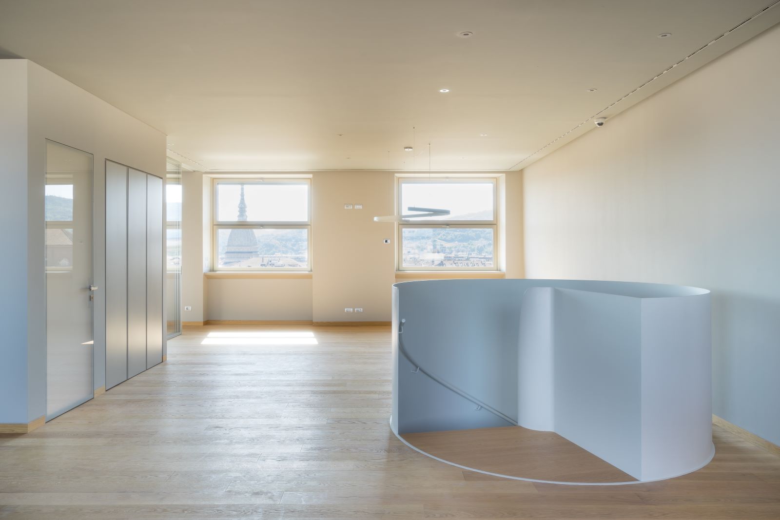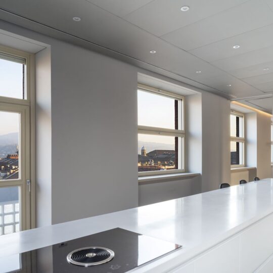Per le partizioni opache è stata invece scelta la neutralità del grigio, scuro per i soffitti e chiaro per le pareti, in grado di restituire le variazioni cromatiche e luministiche del cielo e fungere da sfondo per la successione di finestre-quadro sulla città.