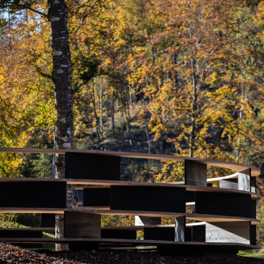 Situata nel giardino di Villa Strobele, in una cornice di arte contemporanea all’aperto, TREE-ROOM è una struttura circolare di 12 metri di diametro che abbraccia tre alberi, simbolo dei boschi spazzati via dalla tempesta Vaia, il 29 ottobre 2018.