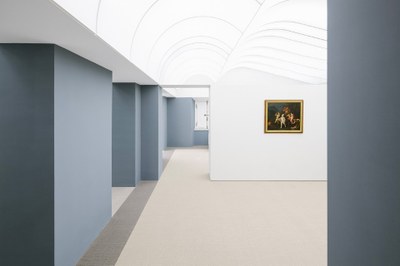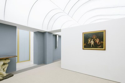 Proprio le volte, spogliate di qualsiasi ambizione decorativa o monumentale e sovrapposte alle superfici monocromatiche dei muri perimetrali, moltiplicate dagli specchi a parete, sono lo sfondo perfetto per le opere esposte, luminoso e quasi astratto come un ambiente ideale.