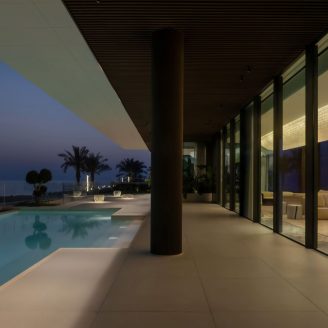 Si tratta di una villa di 4.000 metri a sbalzo sull’acqua che gode di un’ineguagliabile vista grazie ad un affaccio diretto sul mare. La massimizzazione dell’apertura degli spazi interni crea un continuum orizzontale e verticale enfatizzato dai setti principali. Le partizioni interne, oltre a definire lo spazio planimetrico, sottolineano la forte verticalità del volume residenziale. Ciò dà origine a spazi per l’abitare aperti, dove le funzioni si susseguono in modo fluido permettendo alla luce e alla natura di farne parte.