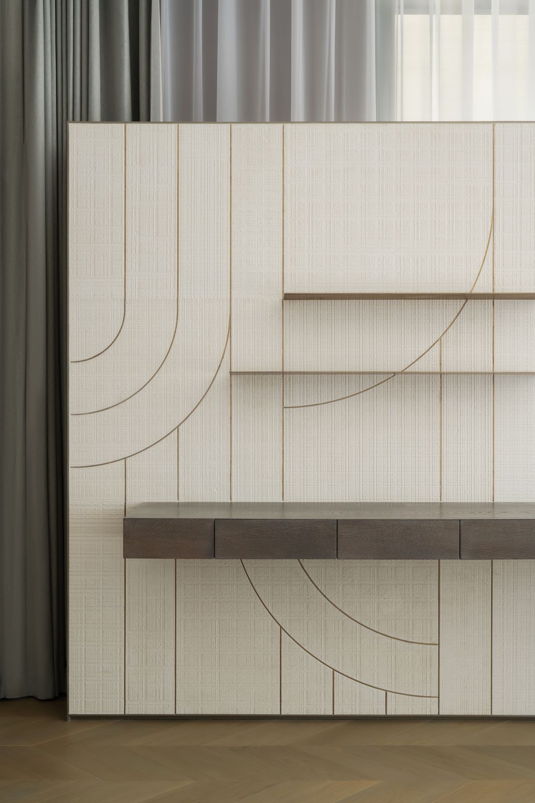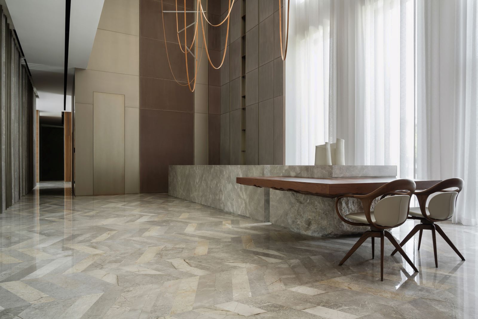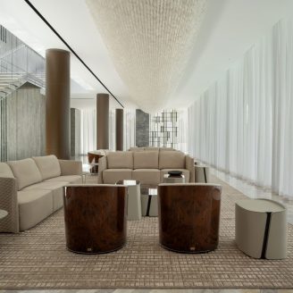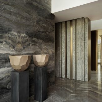 Per il fit out di tutta la residenza sono state volutamente selezionate diverse lavorazioni della texture della pietra. Si passa da curvature tipiche del bamboo a ricami del tessuto fino alla plasticità del plissè, creando così una veste sempre diversa alle superfici.