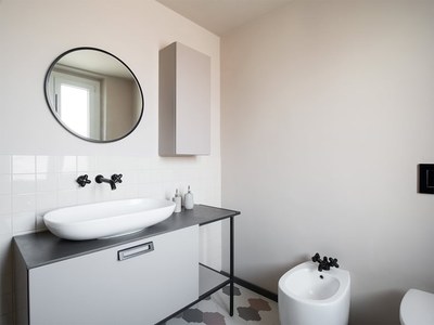 Ancora, in cucina, dove lo spazio è ampliato dalla palette molto chiara e luminosa, l’accoppiata tavolo-sedute fa l’occhiolino a Michelangelo Pistoletto e al suo Quadro da pranzo (1965); infine, la camera da letto, situata sul lato nord, è lo spazio più intimo, fortemente minimalista e con un pattern grafico più tradizionale, rilassante.