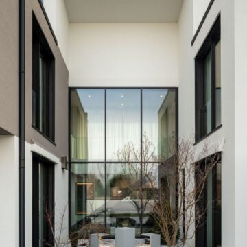 Il concetto di intersezione e permeabilità fra i volumi si ritrova anche nel rapporto tra interno ed esterno, in continuità diretta tra loro grazie alle ampie porzioni vetrate che segnano i fronti; questo legame con l’outdoor è ben rappresentato dall’ampia scala interna che permette una “promenade” visuale sul giardino di inspirazione zen, cuore della corte sul lato opposto all’ingresso, con ciottoli bianchi alternati a una costellazione geometrica di presenze verdi.