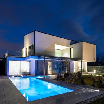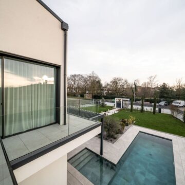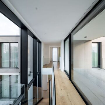 L’interior replica le tonalità neutre dell’involucro, con l’impiego di parquet in rovere chiaro per le pavimentazioni che richiama la finitura della terrazza, del bordo piscina e della facciata dell’ingresso principale, al piano terra. L’illuminazione puntuale di nicchie e disimpegni, infine, si accorda armoniosamente con la luce naturale veicolata dalle ampie vetrate, su entrambi i piani.