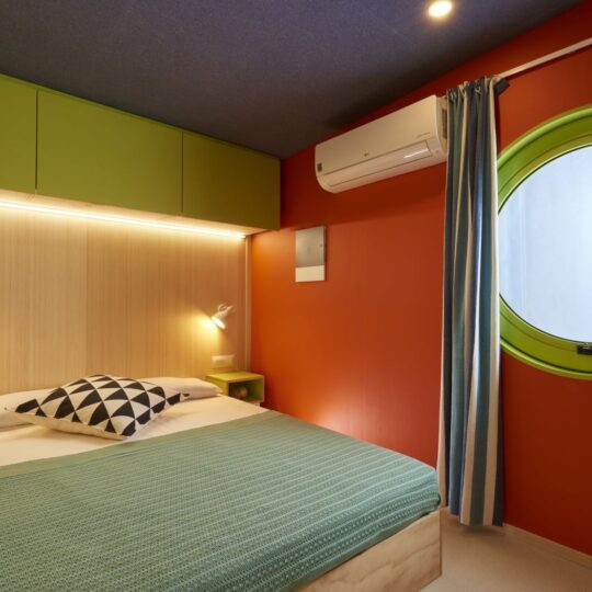 Inoltre, la mobile home è dotata di sistema multimediale e consolle giochi mentre nella quota inferiore si trova la vera “wonderland”: ampi passaggi cilindrici a tunnel che – nascosti sotto la terrazza – creano un playground privato per ciascuna mobile home, oppure, un cluster con il posizionamento di altre unità identiche che trasformano l’area del camping in un immenso parco giochi.